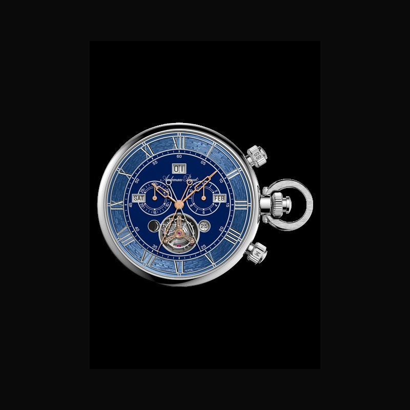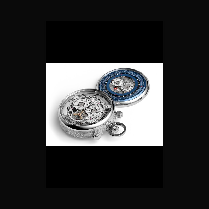 | Plus de caractéristiques : | Mouvement Calibre 1150 à remontage manuel Diamètre total 34,3 mm (15 lignes) Épaisseur totale 8,9 mm Nombre de composants 1 099 Nombre de pierres 81 Réserve de marche minimum garantie 60 h Fréquence du balancier 3 Hz (21 600 alternances/heure) Boitier Boîtier en platine gravé à la main, glace et table d’harmonie de la Supersonnerie en saphir avec traitement antireflets Cadran Cadran émaillé bleu translucide CADRAN DU CALENDRIER UNIVERSEL Cadran en or gris 18 carats avec gravure à la main d’un traçage d’étoiles remplie d’émail translucide, indications blanches et disques dans les tons de titane Chaîne Chaîne en platine conçue main (~ 40 cm) équipée de deux fermoirs à ressort LISTE COMPLÈTE DES FONCTIONS ET COMPLICATIONS / COMPLICATIONS Fonctions informatives autonomes (ou admises par convention). 1. Tourbillon (par convention) 2. Affichage du jour 3. Quantième 4. Affichage du quantième par grande date 5. Affichage du mois 6. Affichage de l’année, disques unités et dizaines (quantième semi-grégorien) 7. Calcul mécanique du bissextile (quantième semi-grégorien, avec indication) 8. Calcul mécanique de l’exception du bissextile tous les cent ans (100 / 400 ans, avec indication) 9. Système de la phase de lune 10. Affichage « lune-image » 11. Affichage seconde chronographe 12. Affichage minutes chronographe 13. Affichage heures chronographe 14. Rattrapante 15. Mécanisme de répétition de l’heure 16. Mécanisme de répétition des quarts 17. Grande sonnerie 18. Petite sonnerie 19. Répétition des minutes 20. Affichage de l’année, disques unités et dizaines (calendrier universel) 21. Calcul mécanique du bissextile (calendrier universel, avec indication) 22. Disque des centaines et millénaires 23. Affichage de la nature de l’année (commune ou bissextile) 24. Disque calendrier annuel mobile pour les années bissextiles 25. Disque calendrier lunaire mobile 26. Disque des semaines mobile 27. Disque pointeur des fêtes culturelles mobiles 28. Pointeurs de nouvelle lune selon système hégirien / ERGONOMIE MÉCANISÉE INTUITIVE Fonctions non informatives assistant l’usage, la fiabilité, la correction ou la qualité perceptive. 1. Échappement à grande amplitude 2. Affichage de l’heure et de la minute (lisibilité / ergonomie de lecture) 3. Mise à l’heure bidirectionnelle 4. Antichocs 5. Correction rapide du quantième 6. Correction quantième bidirectionnelle 7. Correction rapide des mois bidirectionnelle 8. Correction rapide de l’année, indirecte 9. Correction rapide des jours, unidirectionnelle 10. Correction rapide de la lune, unidirectionnelle 11. Mécanisme de départ / arrêt du chronographe (sans saut d’aiguille) 12. Mécanisme de remise à zéro du chronographe (effort maîtrisé) 13. Mécanisme flyback 14. Mécanisme d’activation / désactivation de la rattrapante 15. Mode silence de la sonnerie 16. Mécanisme de synchronisation (sonnerie / affichage) 17. Embrayage de sonnerie vertical à basse consommation 18. Temporisateur 19. Levées à faible consommation 20. Marteau pour le son aigu avec butée élastique anti-rebond 21. Marteau pour le son grave avec butée élastique anti-rebond 22. Verrouillage de la sonnerie en cas de décharge du barillet 23. Isolation de la sonnerie lors de la mise à l’heure 24. Couronne débrayable de protection des mécanismes de sonnerie 25. Remontage manuel unidirectionnel de la sonnerie 26. Silence des quarts 27. Régulateur silencieux 28. Table d’harmonie 29. Correction rapide bidirectionnelle du calendrier universel 30. Mécanisme de commande de la couronne 31. Poussoir multifonctionnel à 2H 32. Poussoir multifonctionnel à 4H / MOUVEMENT Éléments constitutifs sans statut fonctionnel autonome. 1. Énergie du mouvement 2. Énergie de la sonnerie 3. Couronne multifonctionnelle 4. Compensation de parallaxe du poussoir à 2H 5. Compensation de parallaxe du poussoir à 4H 6. Compensation de parallaxe de la couronne |
