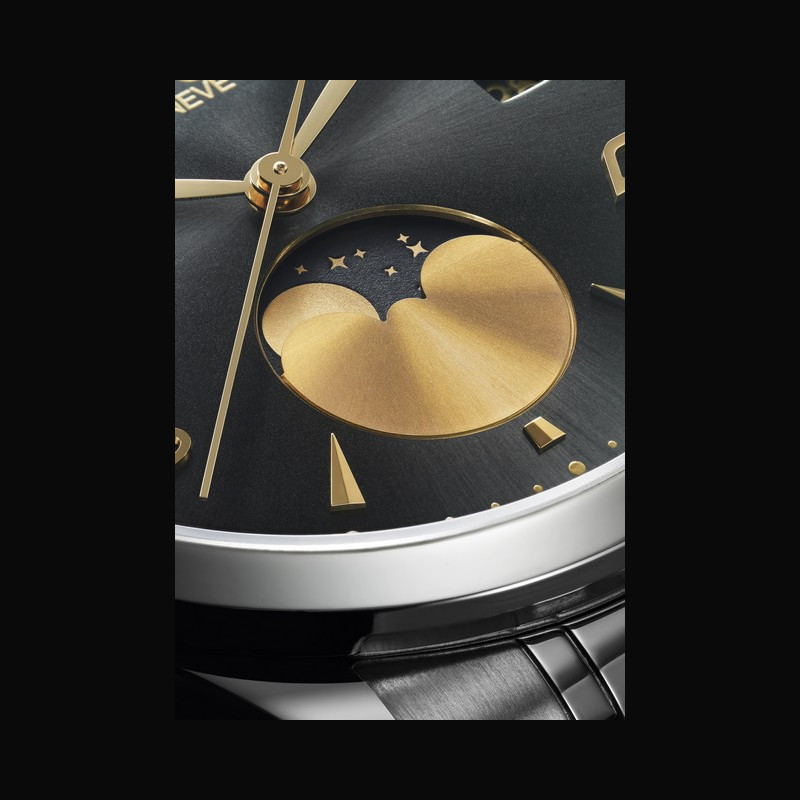 Leurs détails foisonnants créent des jeux de lumière complexes et saisissants qui se marient parfaitement aux aiguilles en forme de glaive assorties. Lʼindicateur des phases de la lune, quant à lui, ajoute une touche poétique inédite à la montre.