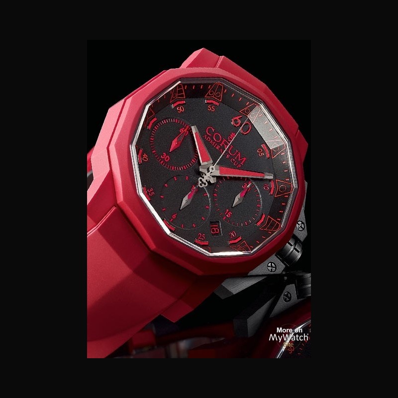 | + Plus de caractéristiques : | Mouvement Chronographe automatique. CO753. certifié COSC 13 ¼’’’ Fréquence : 4 Hz. 28'800 alternances/h 27 rubis Finition spécifique CORUM dont masse oscillante colorée dans la couleur du modèle Réserve de marche de 48 heures Cadran Noir avec index rouges Verre saphir dodécagonal Aiguilles des heures. des minutes et des compteurs facettées Boucle triple déployante en acier gravée du logo CORUM |