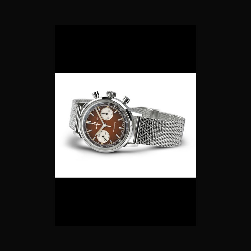 | + Plus de caractéristiques : | Mouvement Chronographe mécanique H-51 avec spiral NivachronTM et réserve de marche de 60 heures Boitier Acier Inoxydable Largeur de l’entrecorne 20 mm Cadran Brun Chaud Bracelet / Boucles Cuir nubuck perforé marron chocolat et bracelet en maille supplémentaire |