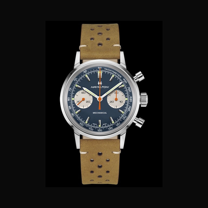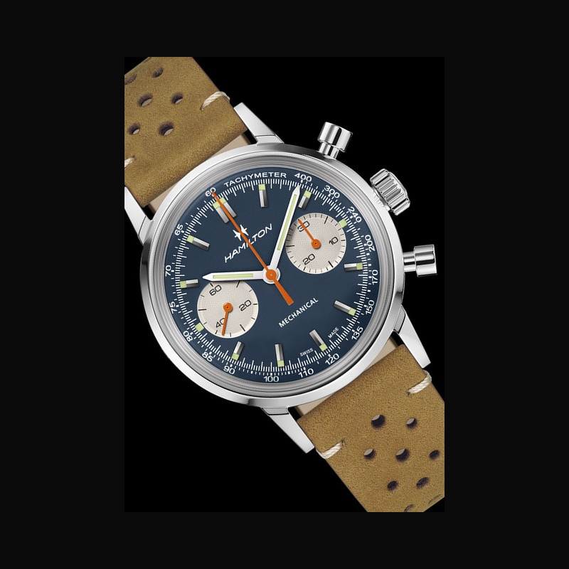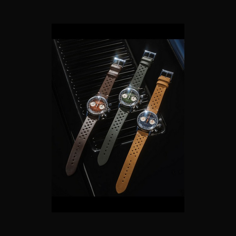 La nouvelle gamme présente les couleurs vert forêt et brun chaud, chacune dotée d’un cadran dégradé fumé qui passe des bords sombres à un centre plus clair afin de mettre en valeur le profil incurvé de l’American Classic Chronograph H. Une troisième référence présente une combinaison saisissante de bleu et d’orange, associée à un bracelet en cuir nubuck brun, à la fois souple et résistant, qui rappelle les matériaux et le design des pistes de l’époque.