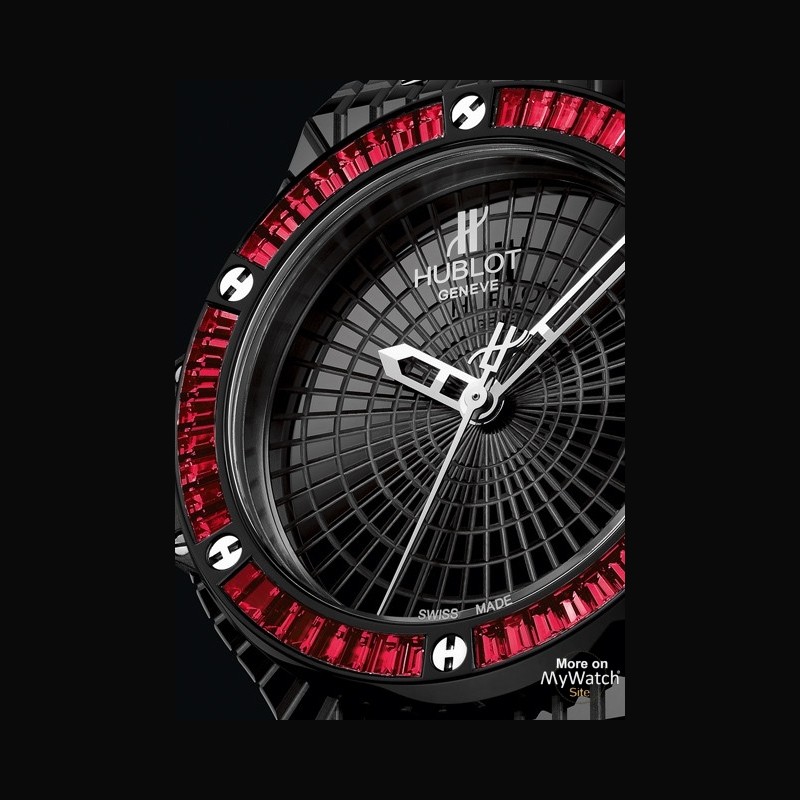 | Particularité du boitier : | Fond saphir Lunette en or gris PVD noir sertie de 48 spinelles rouges baguette |