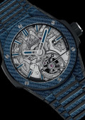 Enfin, la Big Bang Integrated Tourbillon Cathedral Minute Repeater en Texalium bleu met en lumière l’usage intensif que fait Hublot des matériaux de performance telle que la fibre de carbone. Le Texalium possède des propriétés similaires à la fibre de carbone tissée conventionnelle mais il offre davantage de liberté au niveau de son tissage et de ses couleurs. Pour cette pièce unique, Hublot a choisi une teinte bleu foncé qui habille – pour la première fois – le boîtier, la lunette et le bracelet intégré. La répétition minutes offre une expérience acoustique singulière qui est totalement différente des boîtiers traditionnels en métal, caractérisés par des sonneries puissantes et cristallines.
