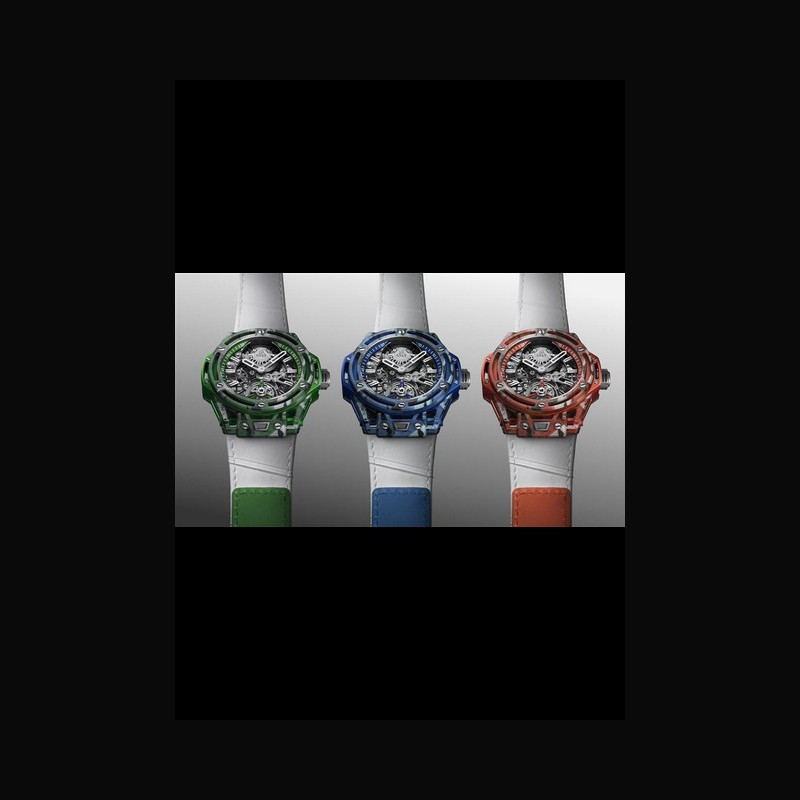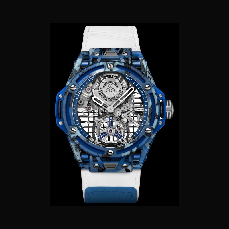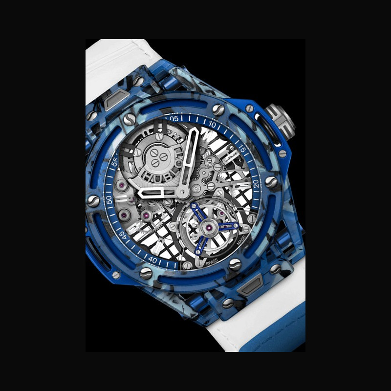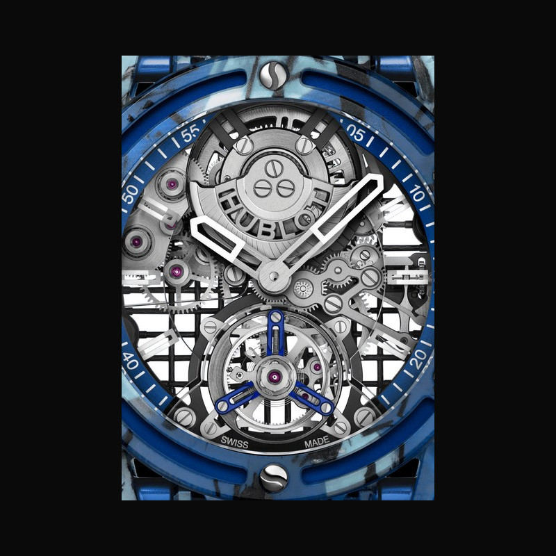 Autre touche élégante : la cage du tourbillon est proposée en aluminium anodisé bleu, orange ou vert, afin d’être assortie à la couleur du boîtier. Le micro-rotor en or rouge 22 carats rhodié, placé à 12 heures, est usiné et gravé au laser pour révéler le logo Hublot. Le mouvement comprend au total 293 composants.