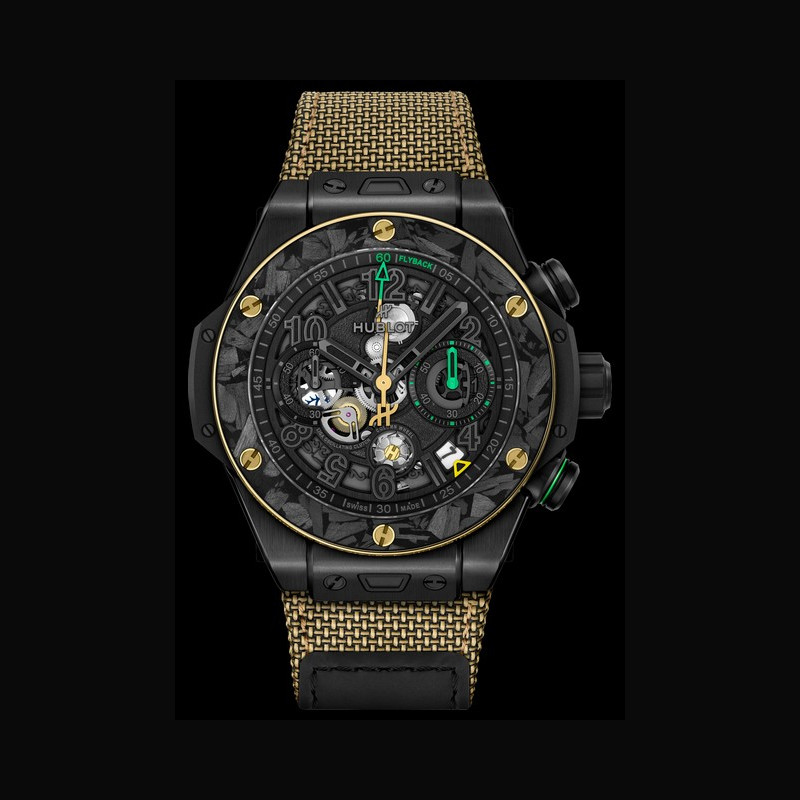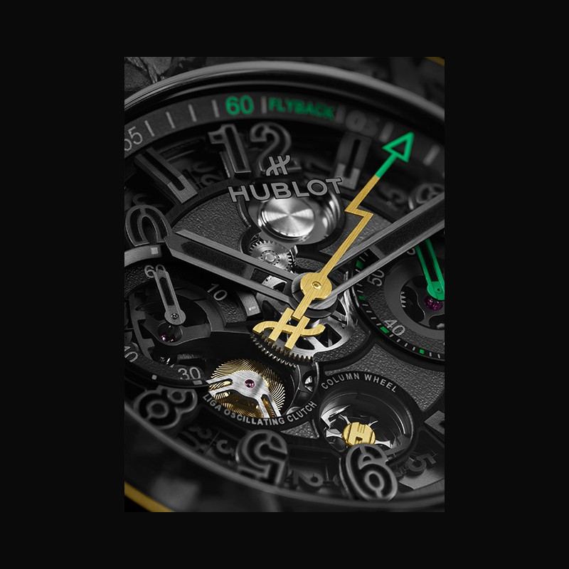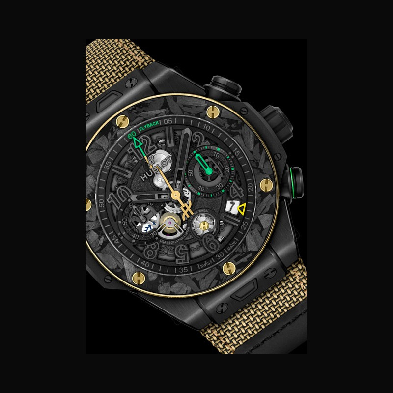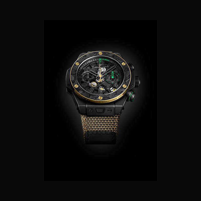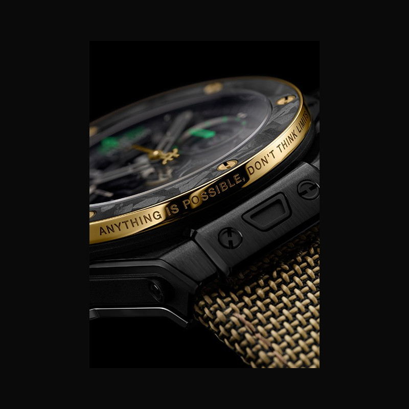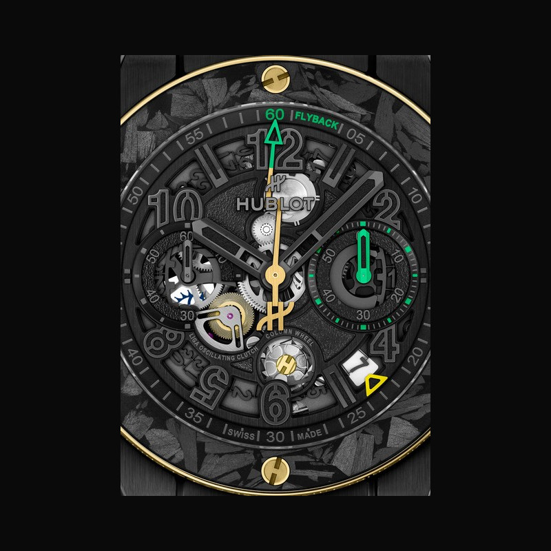La Big Bang Reloaded Usain Bolt interprète le temps selon les codes de l’athlète. Entre 6 et 8 heures, les chiffres 6-5-8 apparaissent sur le cadran. Inversés, ils révèlent 9,58 : le record du monde du 100 mètres établi en 2009. La trotteuse du chronographe en forme d’éclair évoque la pose iconique du sprinter. La lunette en or jaune 18 carats poli porte sa devise : « Anything is Possible, Don’t Think Limits. » Au dos du boîtier, un détail unique : de la terre authentique provenant du terrain d’entraînement de Bolt en Jamaïque, celui qui a façonné l’homme le plus rapide du monde, suspendue entre deux verres saphir à l’intérieur d’un éclair. Encapsulée dans le saphir, elle ancre symboliquement la montre là où son destin a commencé. Des détails distinctifs reliant directement la montre aux racines, au parcours et à l’héritage record d’Usain. Deux bracelets interchangeables équipés du système « One Click » complètent la montre : un bracelet textile Velcro® doré et un bracelet en caoutchouc camouflage noir, jaune et vert. Au cœur de la montre bat le calibre chronographe flyback Manufacture Unico HUB1280, doté d’une roue à colonnes côté cadran, d’un embrayage oscillant et d’une réserve de marche de 72 heures. Le calibre Unico s’expose pleinement : roue à colonnes, embrayage oscillant et fonction flyback sont plus visibles que jamais. Le mouvement se dévoile pleinement, avec des touches vertes et jaunes inspirées des couleurs de la Jamaïque, qui mettent en valeur l’aiguille de chronographe éclair, la roue à colonnes et les indications flyback. La lunette bi-matière en or jaune 18 carats et carbone givré est fixée par six vis signature en forme de H, hommage aux podiums et à l’héritage durable de Bolt.