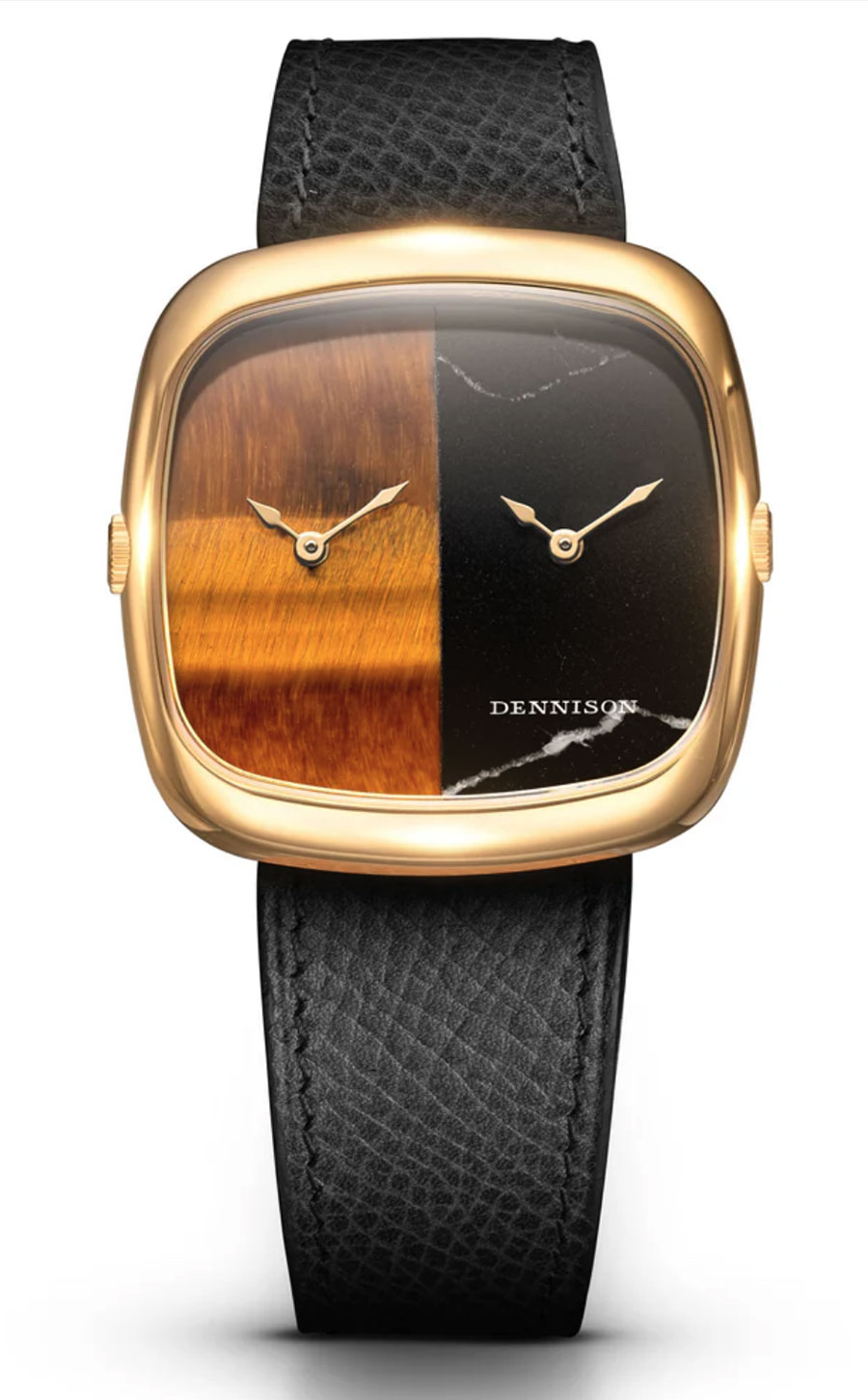Née en 1871 sous l’impulsion d’Aaron Lufkin Dennison, figure majeure de l’industrialisation horlogère, la maison britannique a traversé les décennies avant de fermer ses portes dans les années 1960. Elle renaît en 2024 avec une ambition claire : bousculer les codes en démocratisant l’usage des pierres ornementales. Là où l’horlogerie de luxe s’approprie volontiers malachite, lapis-lazuli ou œil-de-tigre, Dennison les réinterprète dans des garde-temps étonnamment accessibles.
