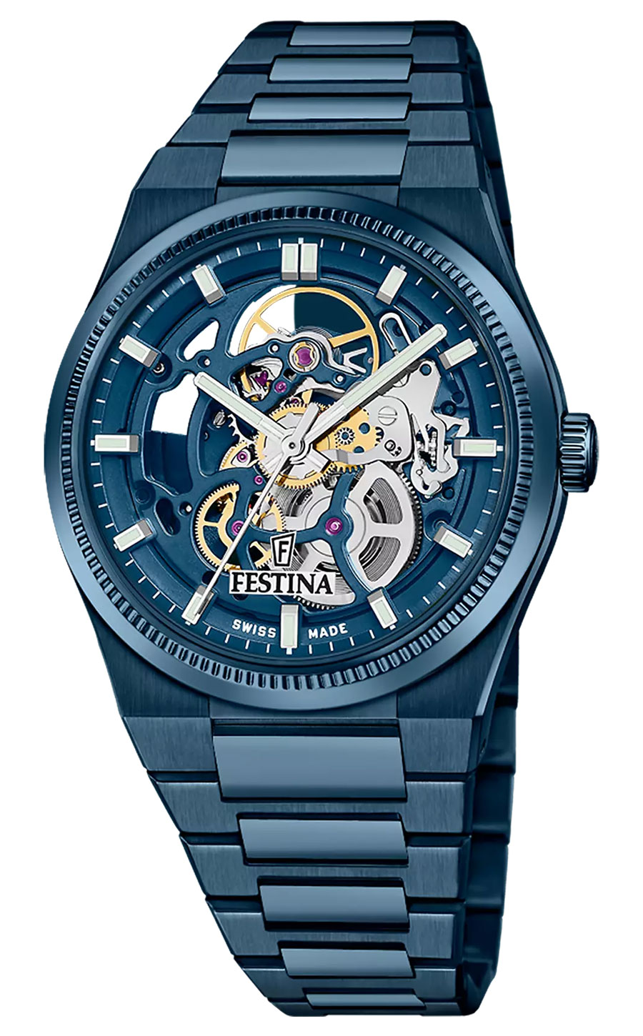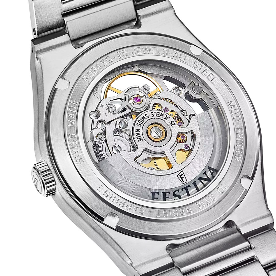 Ce cadran laisse entrevoir les rouages du calibre automatique Soprod, qui appartient au groupe Festina Suisse, avec remontage bidirectionnel et réserve de marche d’environ 38 heures. Ces quatre éditions sont servies sur un bracelet intégré qui épouse parfaitement les formes du poignet pour un confort optimal.