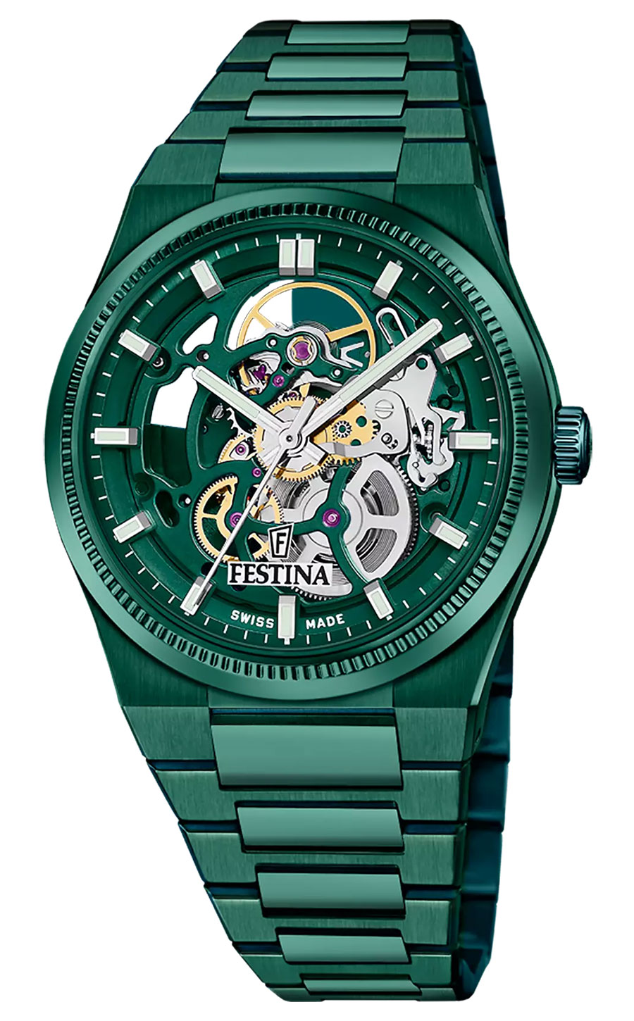 La collection Rivé SQ de la marque Festina Swiss Made présente quatre variations en acier 316L aux différentes finitions : argentée, traitement PVD noir, bleu ou vert. Étanches jusqu’à 100 mètres, les montres arborent un cadran squeletté dont les ponts, la platine et la masse oscillante affichent la même couleur que le traitement PVD, mais dans un effet mat plutôt que brillant.