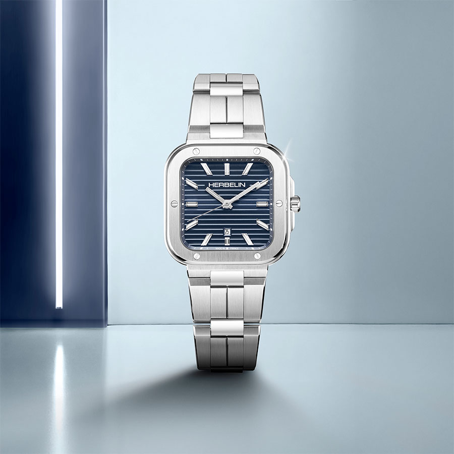 Dans son boîtier carré aux angles subtilement adoucis, la Square 35 revendique l’ADN sport-chic de la collection. Lunette ponctuée de vis décoratives, alternance de finitions brossées verticales et de facettes polies, protection de couronne intégrée : chaque détail structure la silhouette. Protégé par une glace saphir, le cadran bleu profond, frappé horizontalement, capte la lumière au moindre mouvement du poignet. Les index appliqués biseautés et les aiguilles rectangulaires facettées, remplis de matière luminescente, renforcent la signature graphique du modèle. À 6 heures, le guichet date se fait discret mais a le mérite d’exister.