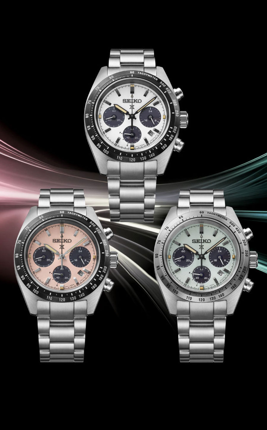 Trois cadrans, trois ambiances. Un blanc classique, un rose et un vert pâle subtil qui revisite le mythique panda des années 60/70. Un clin d’œil assumé aux Speedtimer historiques et à l’âge d’or du chronographe. Les trois compteurs rappellent sans détour les tableaux de bord d’époque : lisibles, contrastés et fonctionnels.