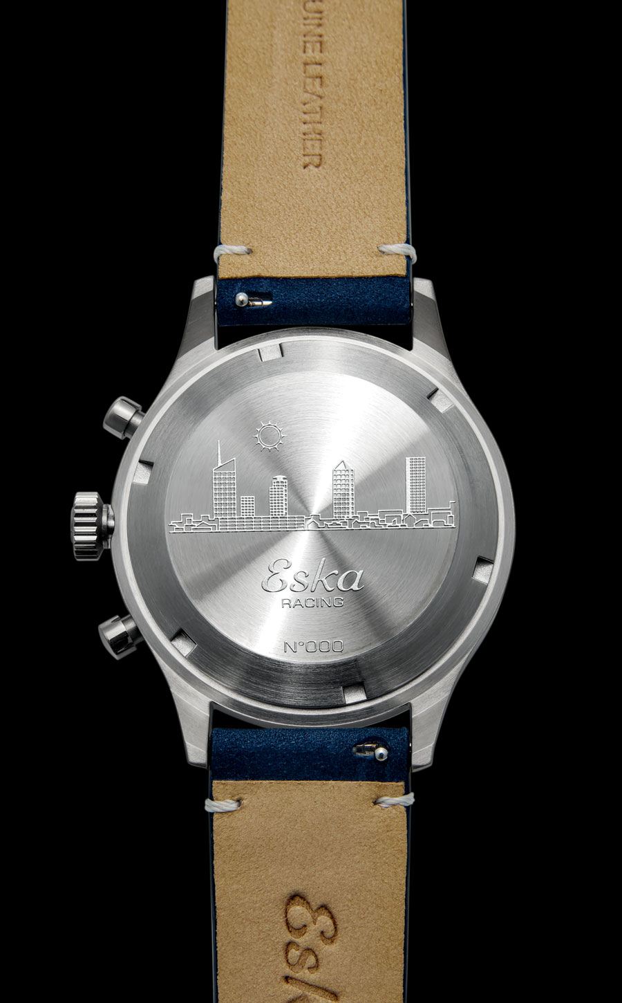 Avec un diamètre de 41 mm pour 12,8 mm d’épaisseur (hors verre), le Chronographe Racing Azur inaugure la collection Eska Watches Light, plus contemporaine et plus polyvalente. Inspirée des levés et couchés de soleil sur la skyline de Lyon – en effet, il existe une version avec un cadran saumon – la collection se distingue notamment par un fond gravé représentant cette silhouette urbaine, signature commune à l’ensemble des modèles.