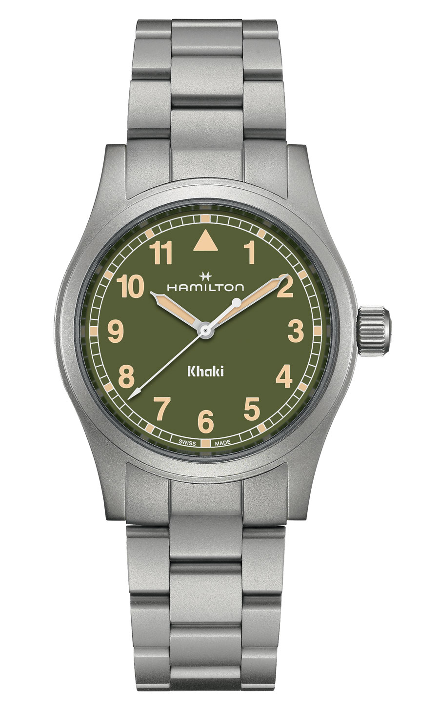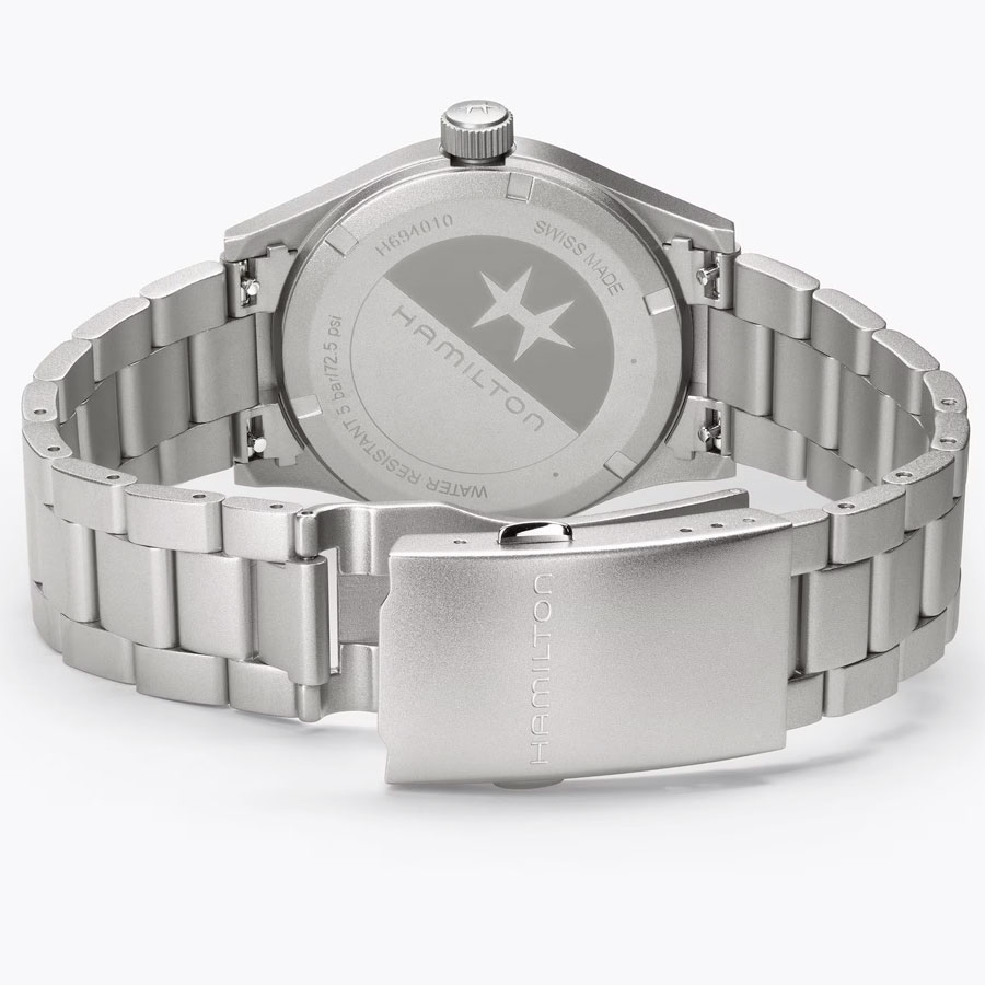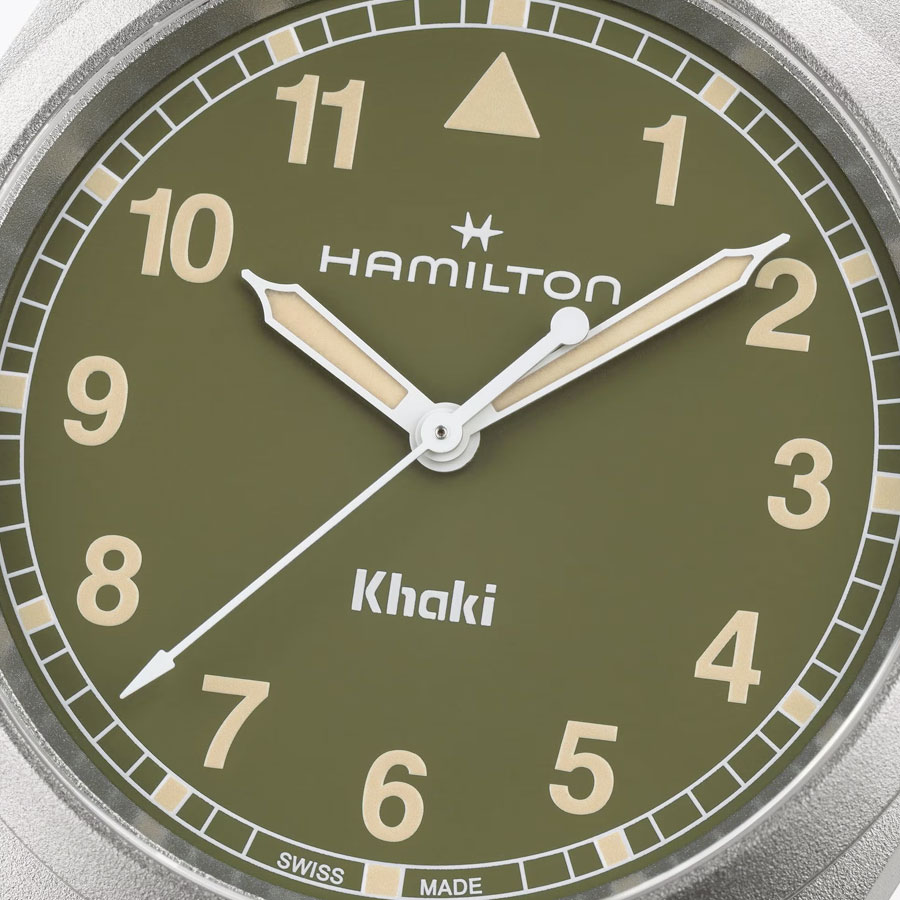 Son design s’inscrit dans la continuité historique de la Maison, en puisant son inspiration dans le modèle Hamilton G.S. (« General Service »), conçu dans les années 1960 pour les services civils du gouvernement britannique. Le cadran, volontairement épuré, privilégie une lisibilité optimale grâce à une minuterie chemin de fer emblématique des montres-outils. Aiguilles, index et chiffres sont recouverts de Super-LumiNova®, proposé, selon les différentes versions, en blanc lumineux ou en vert rappelant le radium autrefois utilisé, assurant une lecture optimale en toutes circonstances.