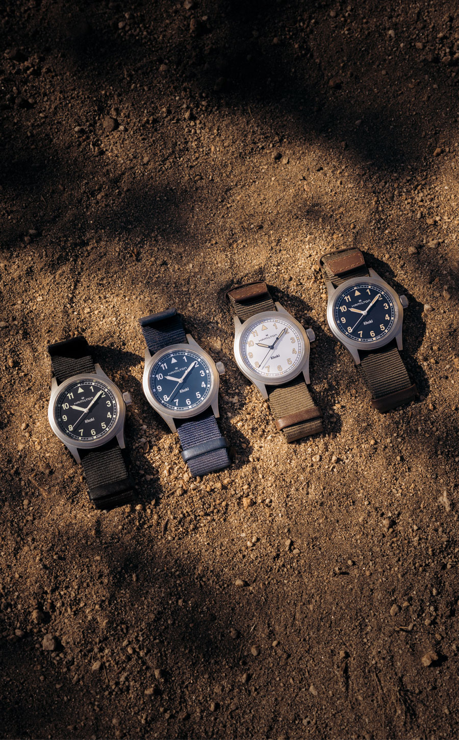 La palette chromatique rend hommage à l’univers militaire, avec des déclinaisons en noir, blanc, bleu ou vert kaki, associées à des bracelets NATO ou en métal.