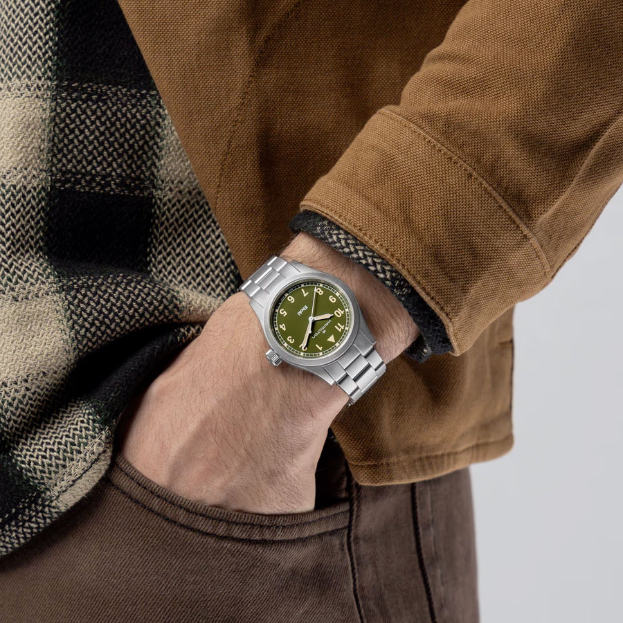 Déclinée en deux diamètres — 33 mm et 38 mm — cette montre reste fidèle à l’ADN utilitaire qui fait la renommée de la marque. Son boîtier compact et robuste renferme un calibre à quartz reconnu pour sa précision, garantissant une utilisation sans contrainte, quelles que soient les conditions.