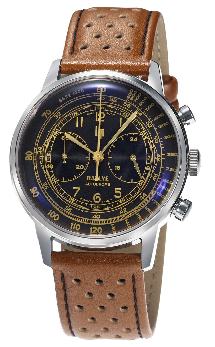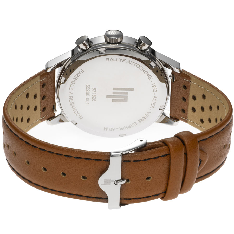 L’esthétique reprend les codes du sport automobile des années 1960 et 1970. Contrasté par des aiguilles et des index dorés, le cadran noir à double finition, mate et soleillée, affiche la signature « Autodrome » et évoque les tableaux de bord des voitures de course de l’époque, tandis que le bracelet en cuir perforé marron clair qui rappelle les gants des pilotes est équipé d’une boucle ardillon chromée.