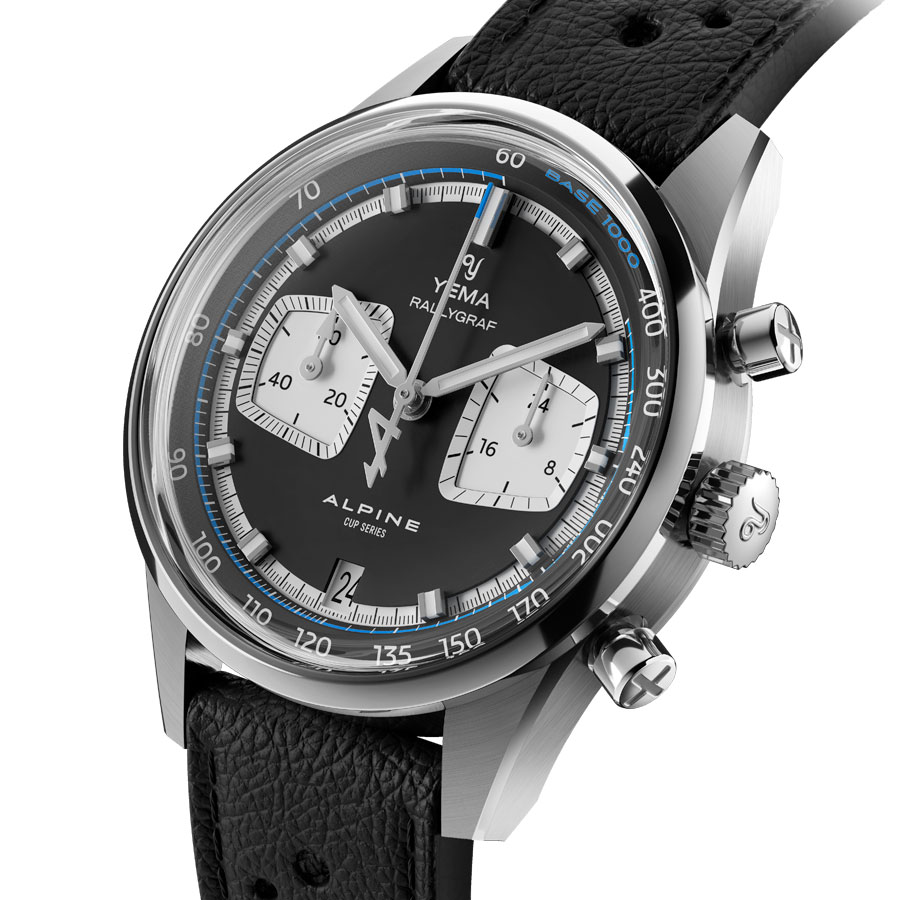 Le cadran bi-compax, inspiré des tableaux de bord vintage, adopte des configurations panda inversé offrant un contraste immédiat et fonctionnel. La date à 6 heures trouve un équilibre avec le logo Alpine Cup Series à 12 heures, tandis que l’aiguille centrale des secondes, soulignée de bleu Alpine, pointe avec précision l’échelle tachymétrique interne. Protégé par un verre minéral K1 à double dôme, le cadran joue avec la lumière et les perspectives, créant un effet d’optique subtil qui évoque les instruments de course d’antan. Enfin, le fond de boîte estampé du logo ALPINE et le bracelet Rallye en cuir perforé, fabriqué en Franche-Comté, parachèvent cet hommage mécanique.