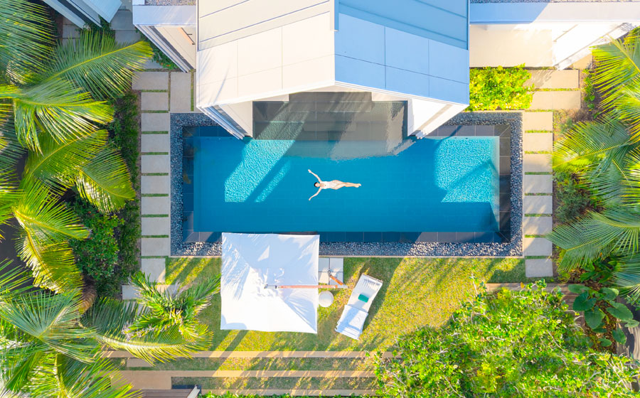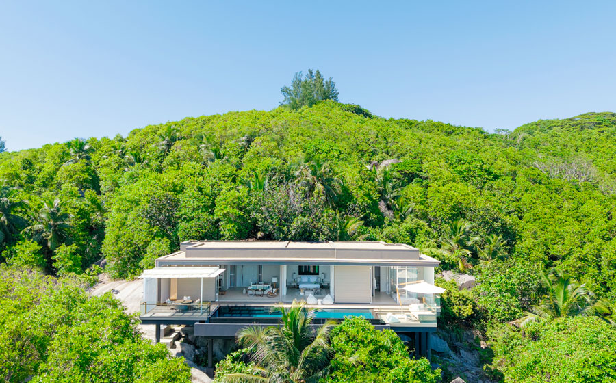 Le concepteur des lieux, Michel Gathy, a misé sur le verre et le blanc, en clair, la lumière. Juste hommage rendu à celle des Seychelles, intense, pure, tonique. Le majordome accompagne les arrivants et pousse la porte de leur royaume, en bord de plage ou perché à flanc de colline. Sidération, personne n’y échappe. Espace, au moins 220 m², façade totalement vitrée ouverte sur l’océan, impeccables lignes droites, salon, chambre à literie XXL, dressing de star et grandiose salle de bains, terrasse suspendue, piscine particulière (12,50 mètres de long), solarium, pavillon pour dîner les yeux dans les yeux… Le tout dans une harmonie de cuirs, de voilages légers et de bois blond.