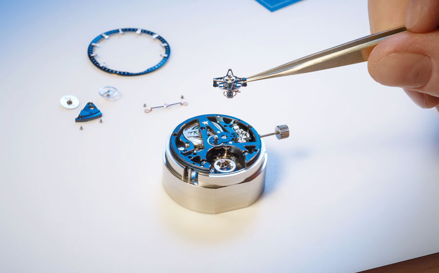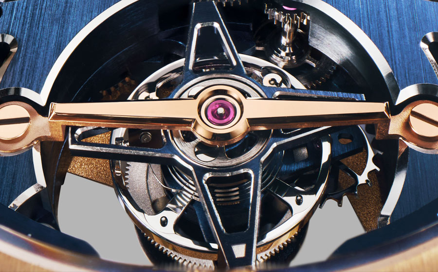 Battant à 36 000 alternances par heure, le tourbillon une minute trône à 6 heures, comme suspendu dans sa cage composée de 56 éléments. Le squelettage, traité en PVD bleu, joue sur les contrastes avec des chanfreins rhodiés polis. Deux ponts architecturaux positionnés à 10 heures et 2 heures introduisent un relief à double niveau. Le barillet ajouré laisse quant à lui apparaître le déroulement du ressort, illustrant visuellement la réserve de marche de 50 heures.