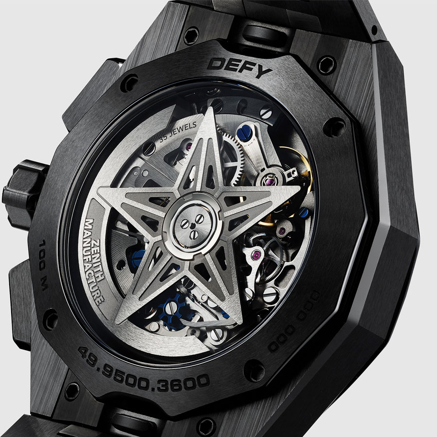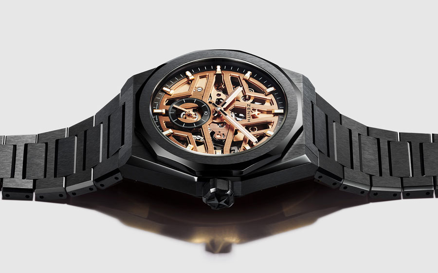 Ici, Zenith expose une mécanique comme on érige une structure, en laissant volontairement visibles ses forces, ses tensions et ses rythmes. Le boîtier de 41 mm en céramique noire, alternant surfaces satinées et facettes polies, agit comme un écrin monolithique, à la fois résistant et graphique, conçu pour dialoguer avec la lumière.