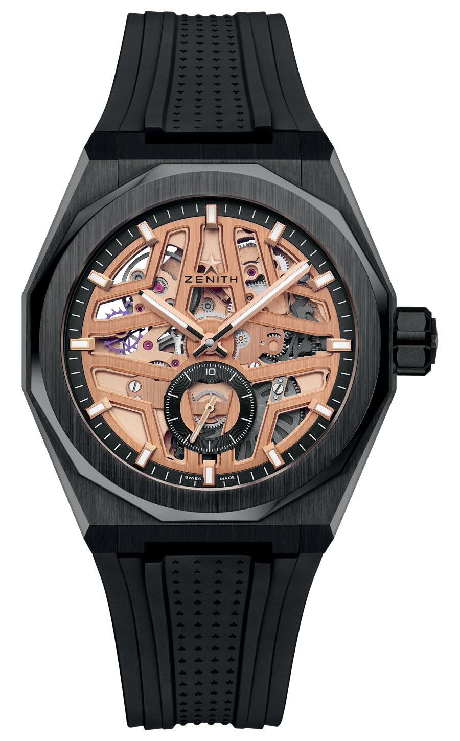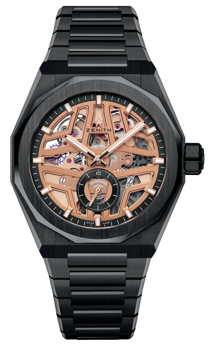 Au cœur du caractéristique boîtier facetté de 41 mm en or rose, le mouvement s’organise autour d’un rehaut périphérique qui concentre les index et renforce la profondeur visuelle. La signature Zenith semble en lévitation sur le verre saphir, tandis que l’étoile s’intègre à la platine, devenant un élément structurel plutôt qu’un simple symbole.