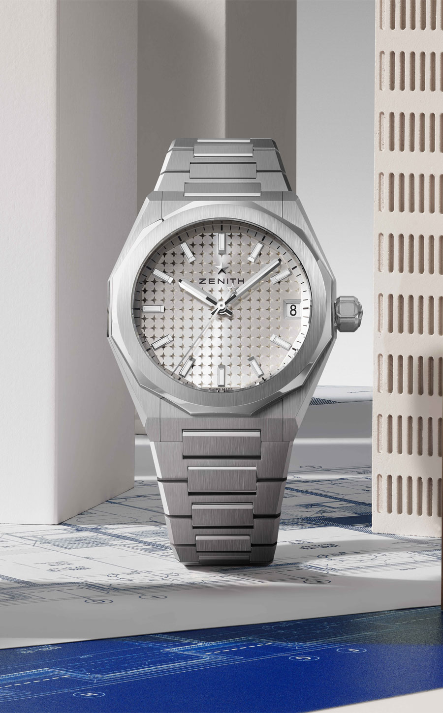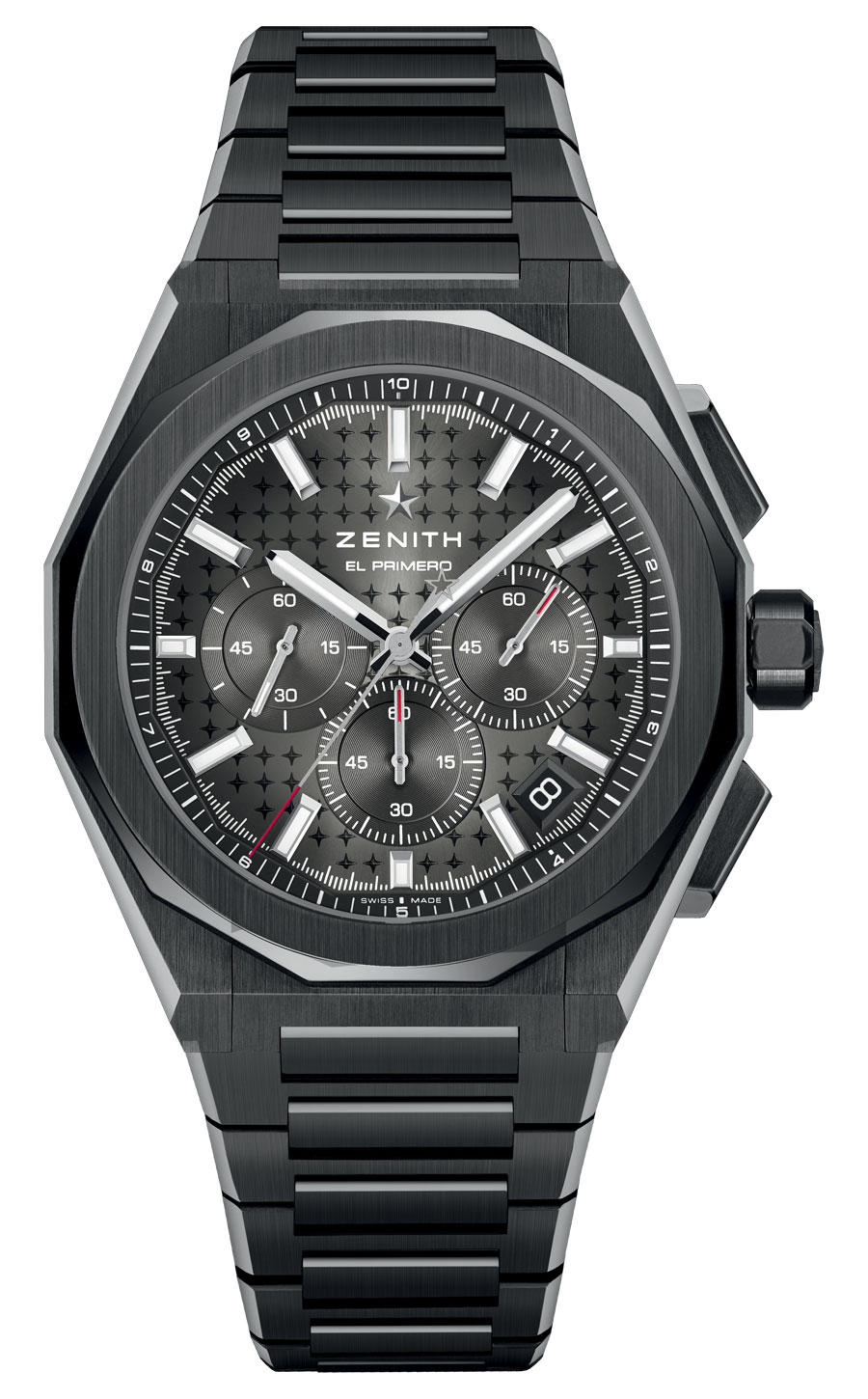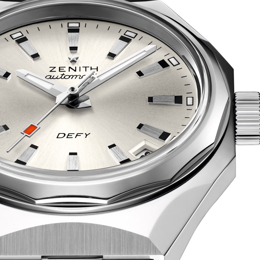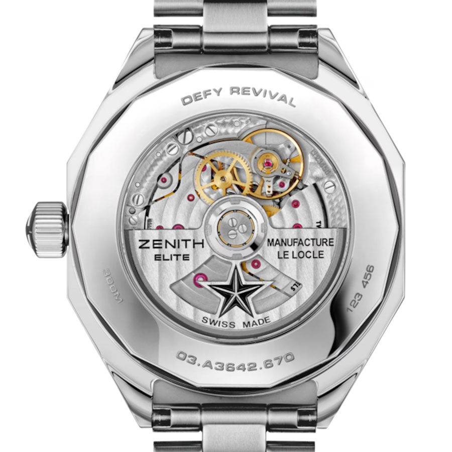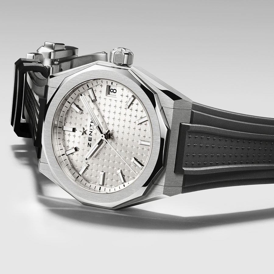 La construction du cadran, structurée autour de l’étoile Zenith à quatre branches, agit comme une charpente mécanique, laissant apparaître chaque organe du mouvement. Les index et aiguilles facettés, traités au Super-LumiNova, assurent une lisibilité constante, de jour comme de nuit. Étanche jusqu’à 100 mètres, la montre est dotée d’un système de bracelets interchangeables sans outil.
