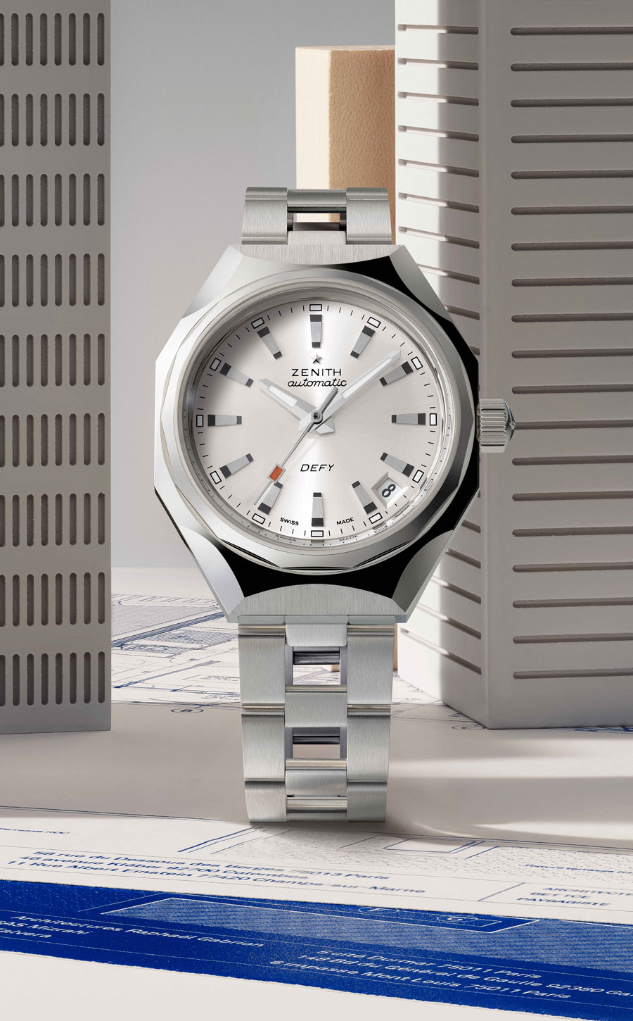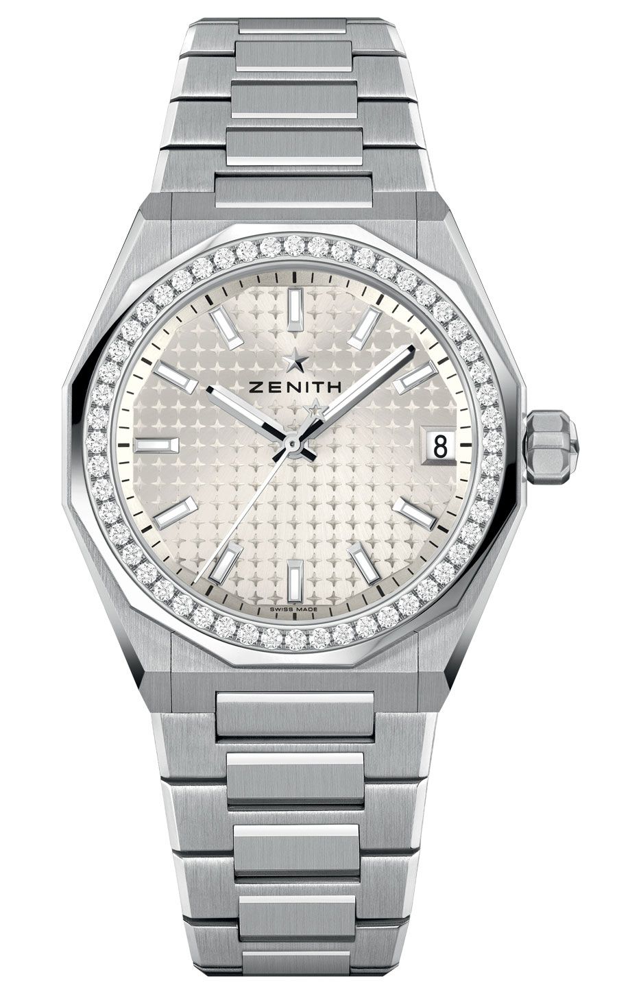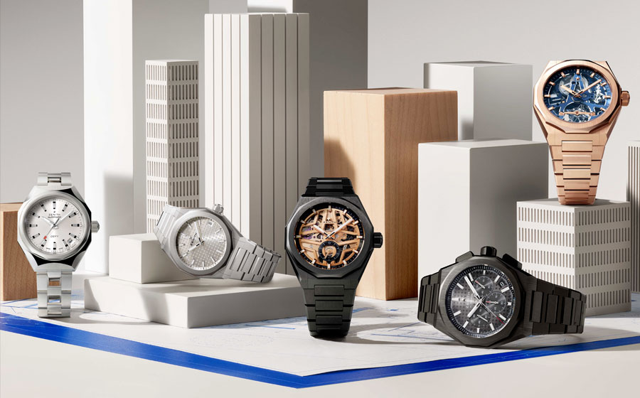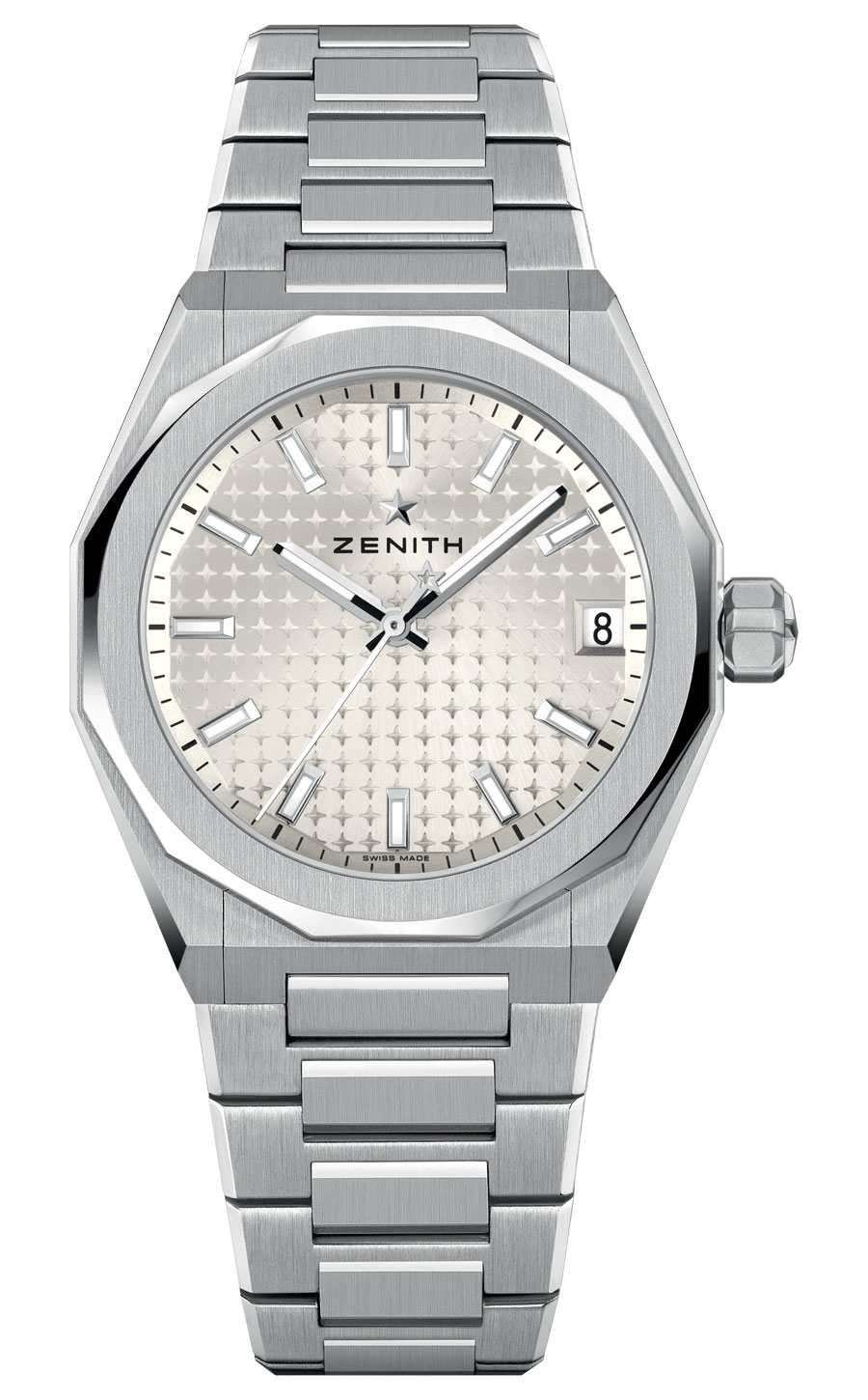La construction du cadran, structurée autour de l’étoile Zenith à quatre branches, agit comme une charpente mécanique, laissant apparaître chaque organe du mouvement. Les index et aiguilles facettés, traités au Super-LumiNova, assurent une lisibilité constante, de jour comme de nuit. Étanche jusqu’à 100 mètres, la montre est dotée d’un système de bracelets interchangeables sans outil.