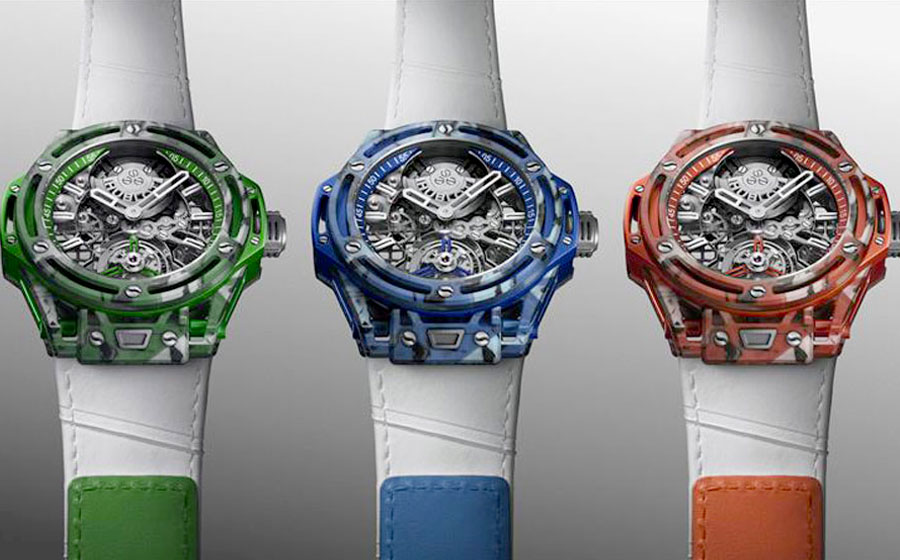 Consulter les fiches techniques des montres Hublot Big Bang Tourbillon Novak Djokovic Goat Edition Green, Edition Blue et Edition Orange.