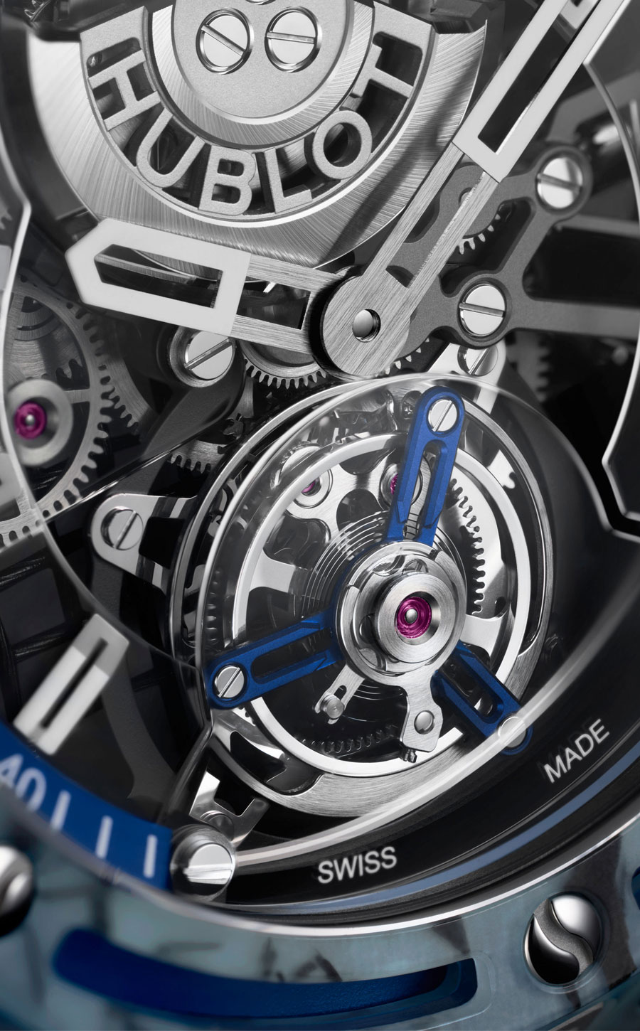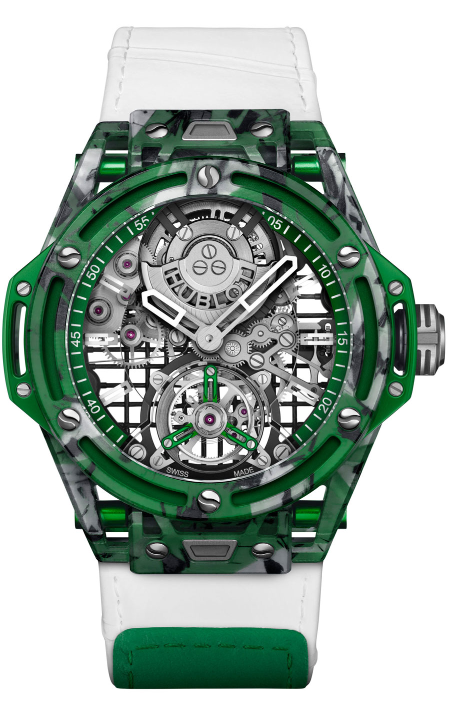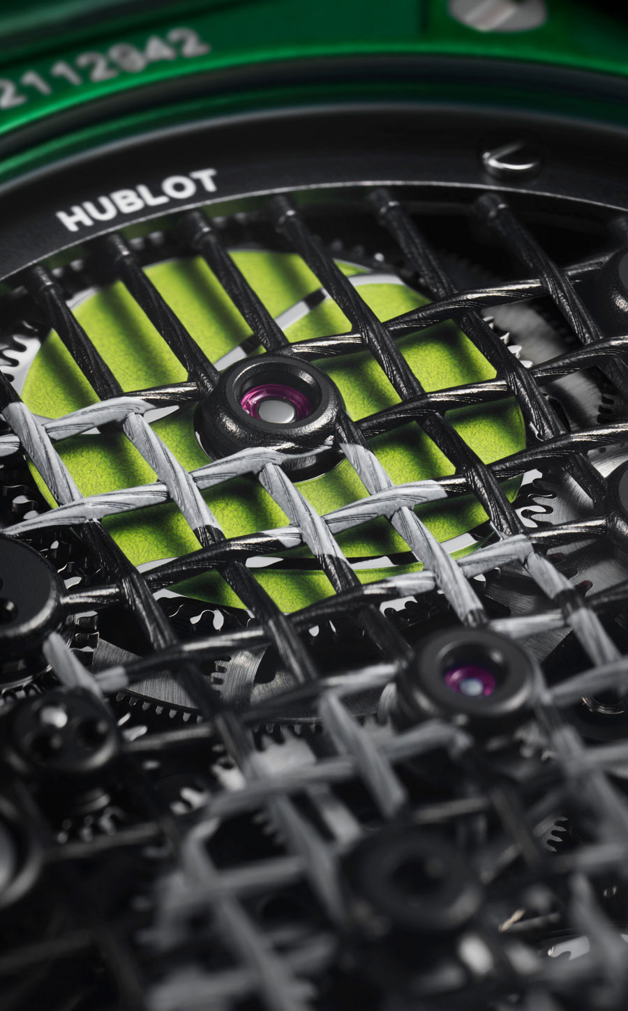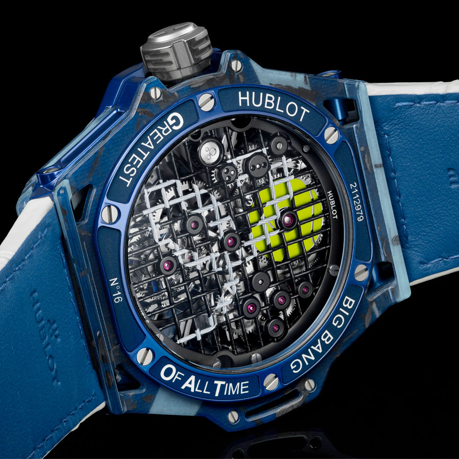 Le barillet, avec ses 72 heures de réserve de marche, est surmonté d’un rochet reproduisant une balle de tennis, réalisé par polissage, gravure laser et laque jaune-vert. La cage du tourbillon, en aluminium anodisé assorti au boîtier, accueille un micro-rotor en or rouge 22 carats rhodié, gravé au laser avec le logo Hublot. Le mouvement, composé de 293 éléments, allie esthétisme, légèreté et performance mécanique.