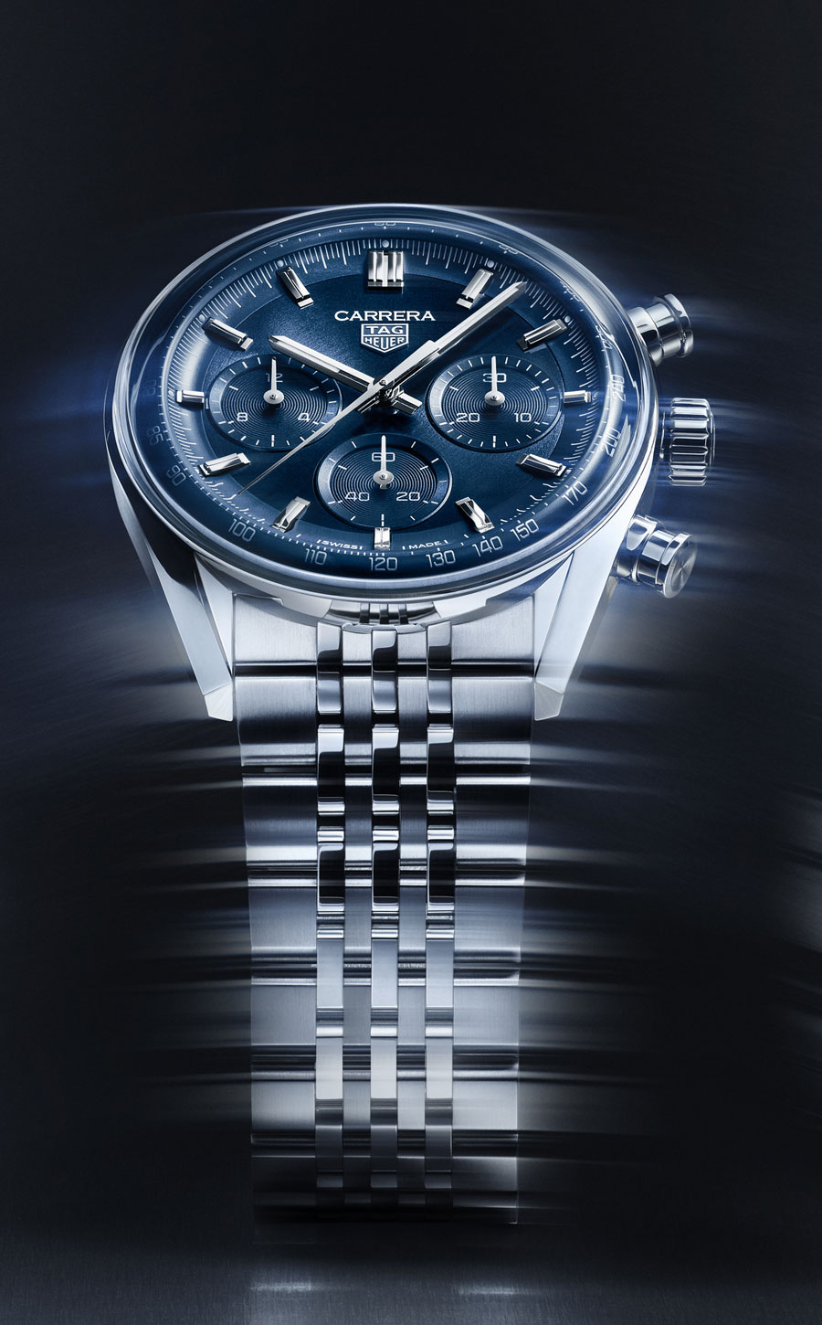 Le cadran bleu brossé circulaire diffuse subtilement la lumière ; les compteurs azurés ton sur ton, aiguilles et index en plaqué rhodium avec Super-LumiNova® blanche assurent une lecture optimale. Le vert, intense et changeant selon le poignet, et le noir, ponctué de détails rouges inspirés de la course, complètent la gamme.