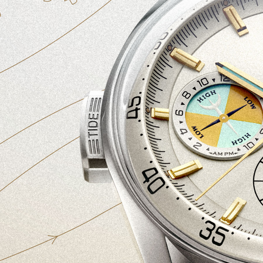 Le réglage s’effectue de manière intuitive grâce à un poussoir dédié, discrètement intégré à neuf heures et gravé de la mention “TIDE”. Une fois synchronisé avec les horaires locaux, le disque affiche les phases de marée divisées en quadrants : « high » (marées hautes) en bleu sarcelle ou « Intrepid Teal » (référence au voilier vainqueur de l’America’s Cup de 1967) et « low » (marées basses) en jaune laqué.