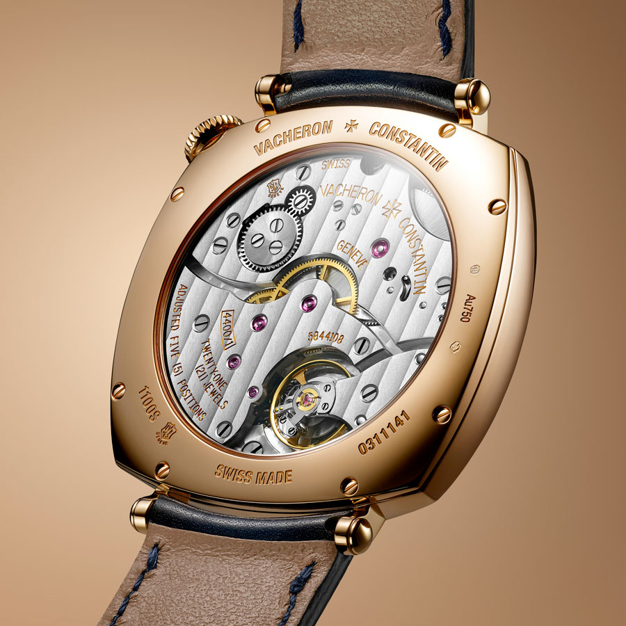 Au dos, le fond en saphir laisse apparaître le calibre de manufacture 500P1. Ce mouvement automatique, oscille à 28 800 alternances par heure (4 Hz) et offre une réserve de marche d’environ 40 heures. Doté d’une masse oscillante gravée, il présente des finitions classiques mais remarquables : Côtes de Genève circulaires, platine perlée, ponts anglés et vis bleuies. Notons que le bracelet en or rose intégré peut être remplacé par un bracelet en alligator bordeaux, livré avec une boucle ardillon en or rose.