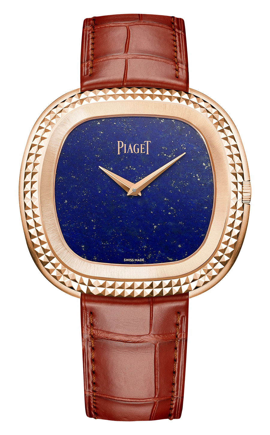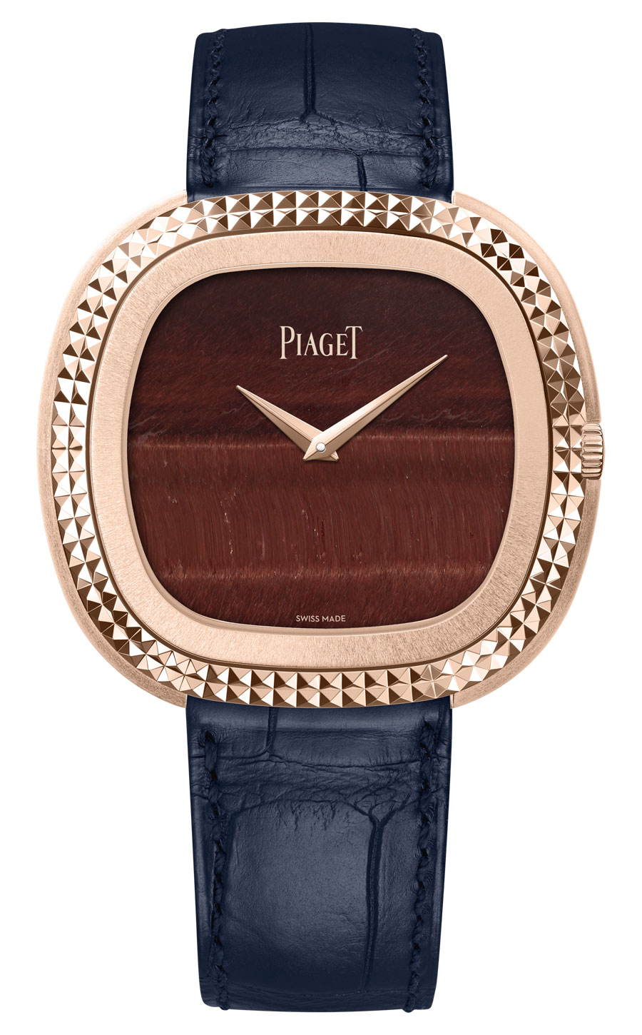 Cette année, cet héritage s’incarne avec force dans deux déclinaisons de la Piaget Andy Warhol. Même architecture : boîtier coussin de 45 x 43 mm en or rose, décor “Clou de Paris”, profil contenu (8,08 mm d’épaisseur) et calibre automatique manufacture 501P1 (40 heures de réserve de marche environ). Une base commune, pensée comme un écrin. D’un côté, le lapis-lazuli : un bleu dense, veiné naturellement, presque céleste, qui capte la lumière en profondeur. Associé à un bracelet alligator brun, il installe une présence feutrée, élégante, presque contemplative. De l’autre, le bull’s eye (œil de taureau) : une pierre aux reflets rouge-brun vibrante, quasi organique. Associée à un bracelet alligator bleu, elle crée un contraste plus saisissant.