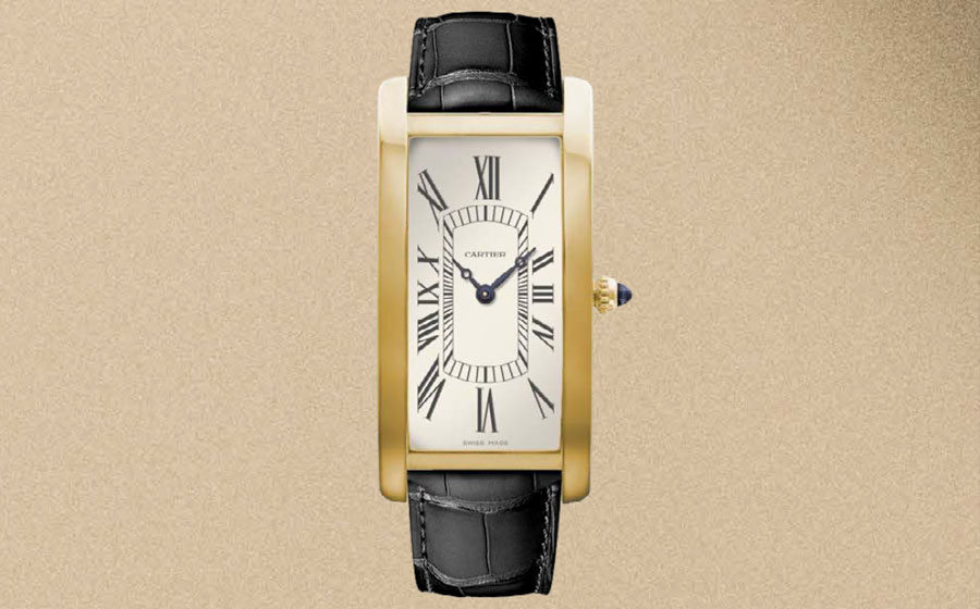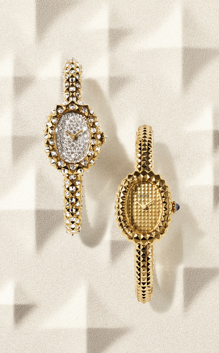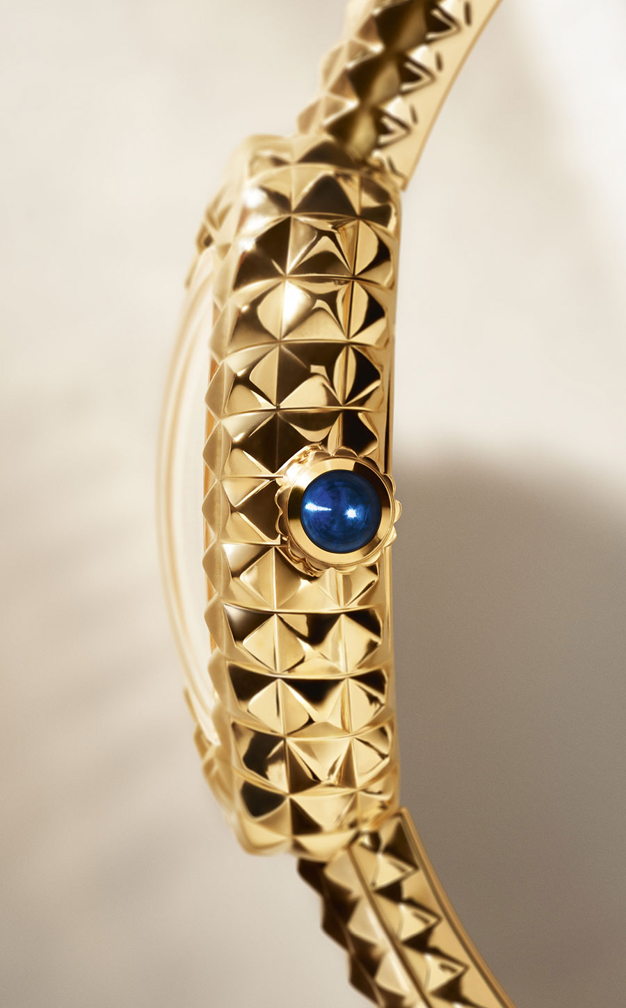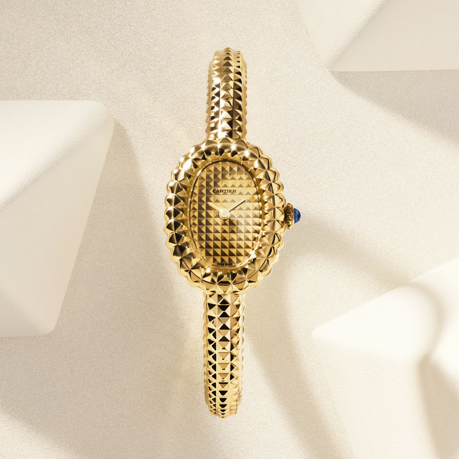 Le boîtier conserve les codes de la Baignoire : forme ovale, couronne de remontoir ornée d’un saphir et cadran épuré. Ce dernier est gravé du motif Clous de Paris qui modifie ainsi la perception des surfaces en introduisant un relief uniforme sur toute la montre.