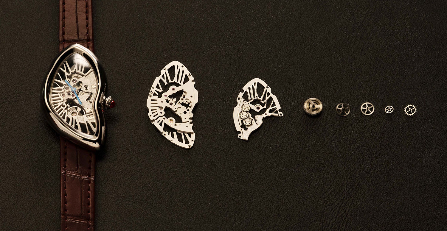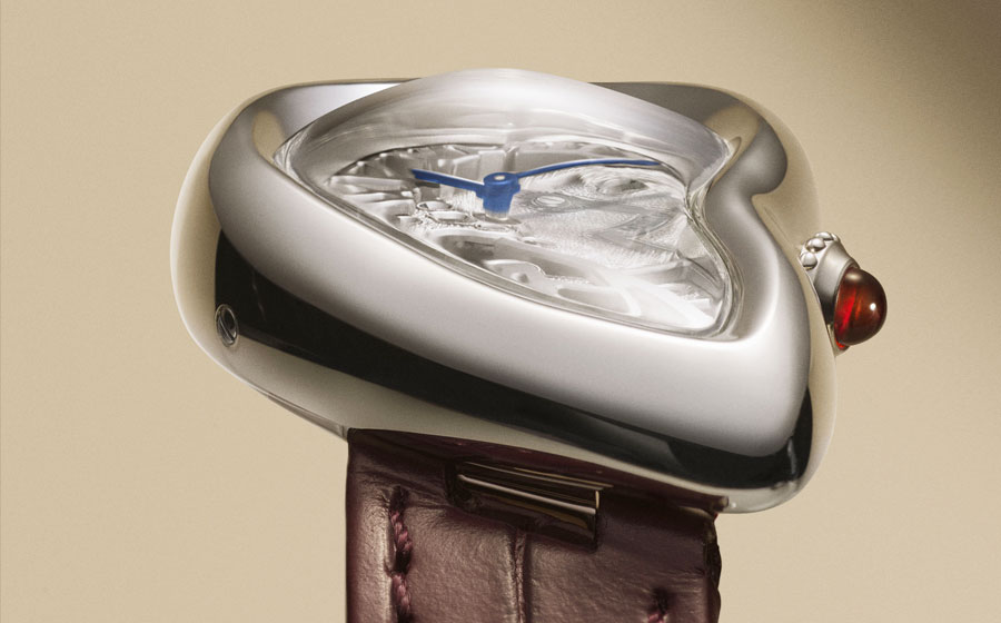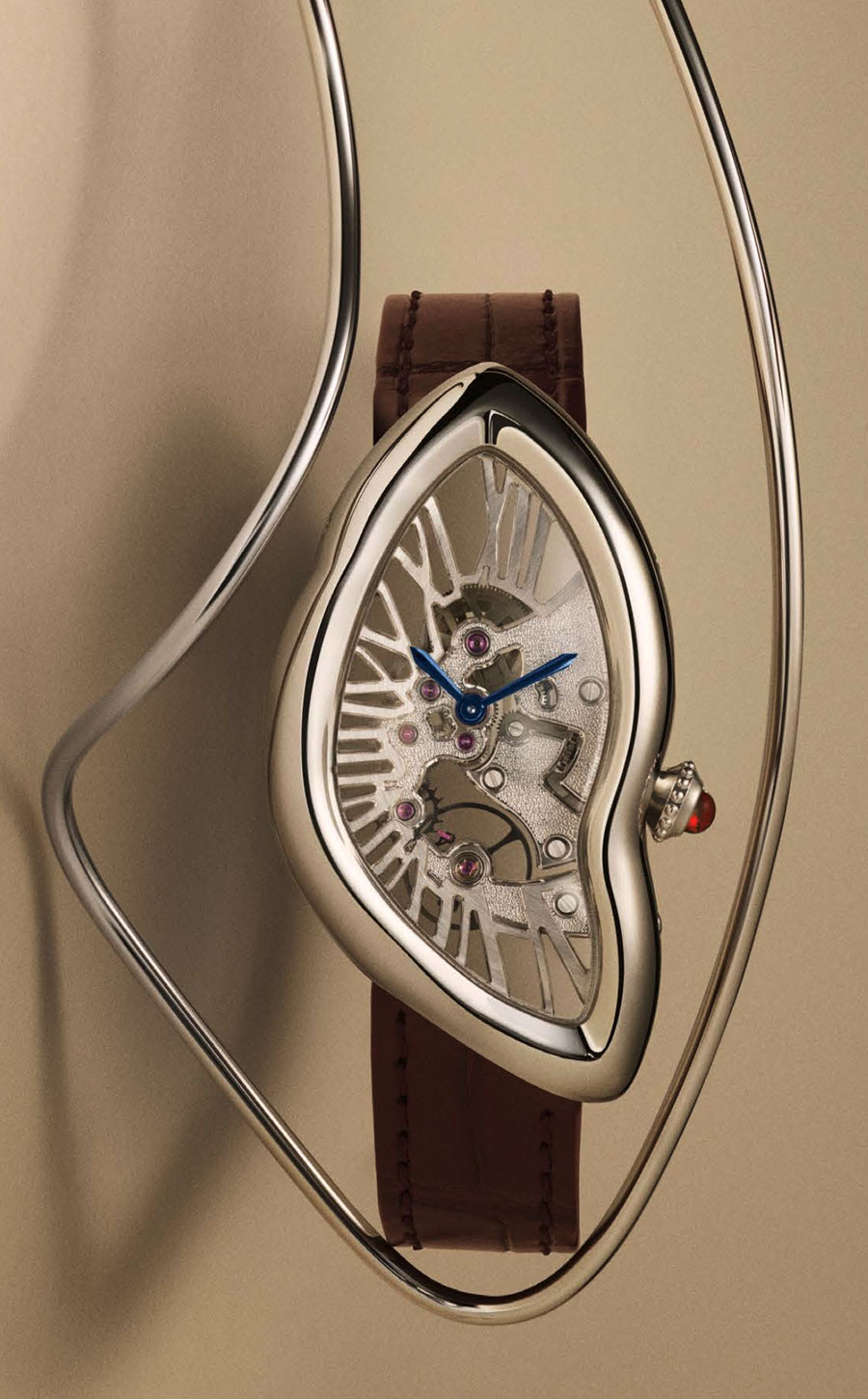 Dans la collection Cartier Privé, la Cartier Crash Squelette poursuit l’exploration des formes historiques de la Maison. Créée en 1967 à Londres, la Crash se distingue par un boîtier asymétrique qui impose une lecture déstructurée du cadran.