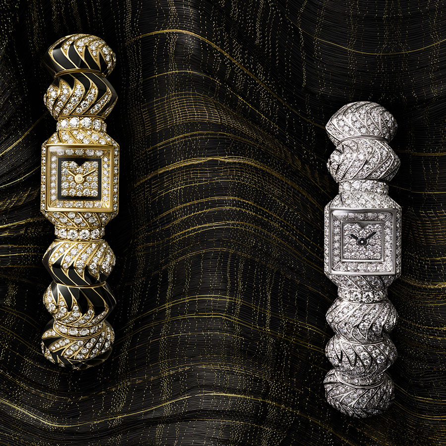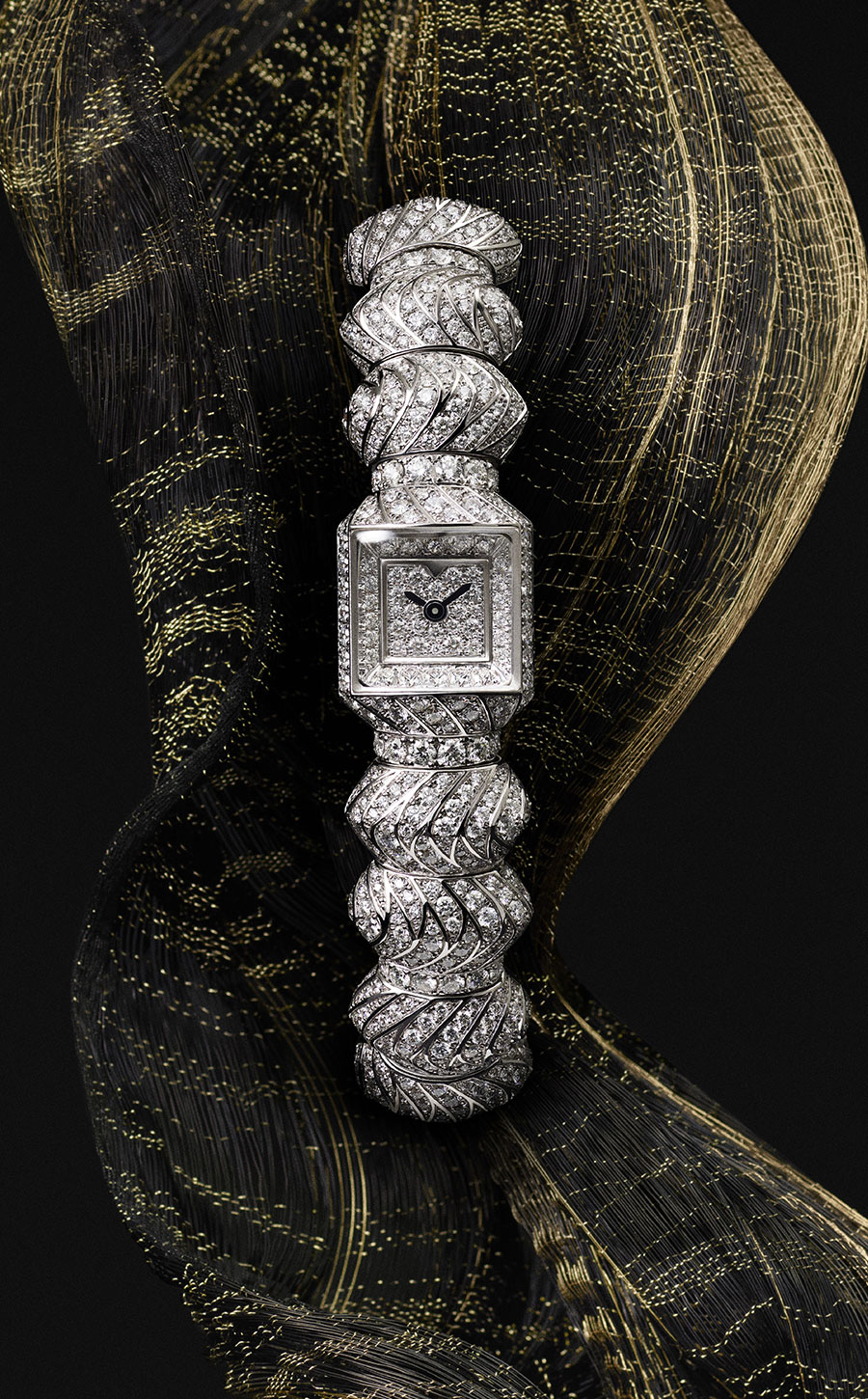 Le boîtier, aux mensurations délicates – 19,7 x 15,4 mm pour 9,9 mm d’épaisseur -, est surmonté d’une glace bombée. Elle abrite un cadran, pavé de 45 diamants taille brillant (0,37 ct) en serti neige et ponctué d’un index triangulaire à midi. L’organisation graphique repose sur une alternance de courbes et de lignes, renforcée par un bracelet associant des sections pavées aux différents motifs. Le sertissage quatre grains, utilisé sur l’ensemble, permet d’intégrer des pierres précieuses de tailles variées afin de créer une pièce étincelante. Dans cette configuration en or gris, la perception des volumes repose uniquement sur les variations de lumière générées par les surfaces serties. Composée de 986 diamants taille brillant totalisant 9,17 carats, cette édition aux allures twistées bat au rythme d’un mouvement à quartz. Notons que le bracelet est disponible en plusieurs tailles.
