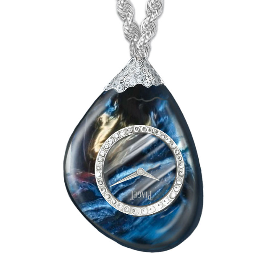 Cette nouvelle série Swinging Pebbles reprend cette construction en l’adaptant. Chaque pendentif-montre est taillé dans un seul bloc de pierre ornementale — ici la pietersite — évidé pour accueillir un mouvement de manufacture, puis refermé pour former un boîtier poli en forme de galet. Cette construction monobloc met en avant la continuité du matériau et la précision d’usinage. Le boîtier en or blanc est serti de diamants et abrite le calibre à quartz 355P, assurant l’affichage des heures et des minutes. L’ensemble est suspendu à une chaîne torsadée en or blanc de 80 cm, conçue comme un élément structurel autant qu’esthétique. Étanche à 30 mètres, cette déclinaison conserve les principes historiques du Swinging Sautoir : intégration du mouvement dans une pierre ornementale, construction fermée du boîtier et interaction avec le mouvement du corps via la chaîne. On adore !