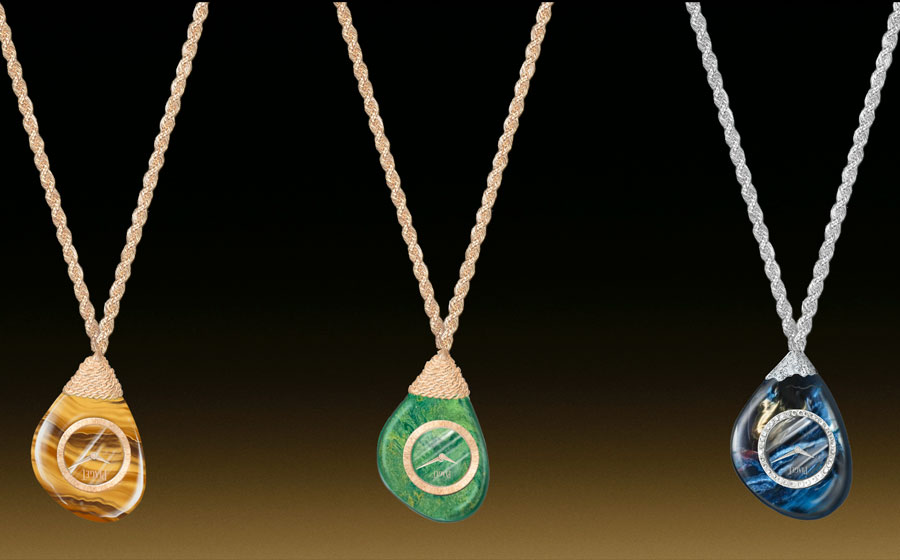 Avec les Swinging Sautoirs, Piaget poursuit une approche initiée à la fin des années 1960, où la montre s’affranchit du poignet pour devenir un objet porté en pendentif. Dès 1969, la Collection du 21e Siècle introduit cette idée en combinant orfèvrerie, pierres ornementales et intégration horlogère dans des formats non conventionnels. Dans les années 1970, sous l’impulsion de Valentin Piaget et en collaboration avec des designers comme Jean-Claude Gueit, ces créations prennent la forme de pièces uniques, centrées sur la matière et le mouvement. Le principe repose sur un cadran en pierre suspendu à une chaîne en or, dont la mobilité fait partie intégrante de l’objet.