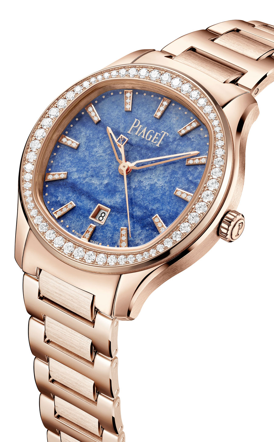 Auréolée d’une lunette sertie de 60 diamants taille brillant, le cadran en quartz bleu introduit une texture minérale qui contraste avec les éléments en or rose. Les index appliqués, également en or rose, sont sertis de 36 diamants taille brillant (3 diamants pour chaque index) tout en conservant une lecture centrée sur les heures et les minutes, symbolisées par des aiguilles ajourées.