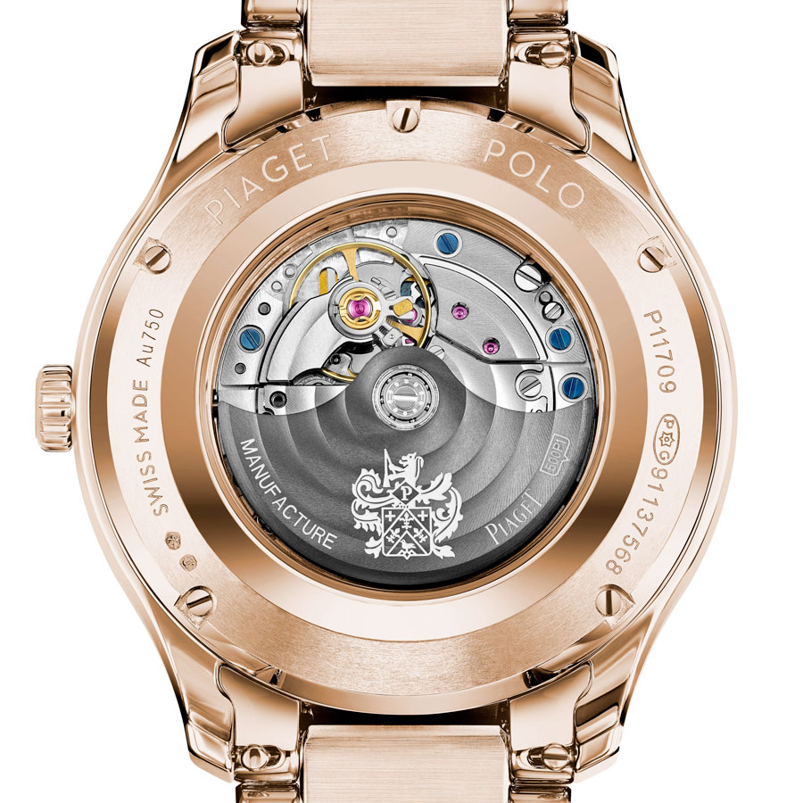Étanche jusqu’à 50 mètres, cette référence conserve les lignes de la collection Polo dans un format compact, avec un boîtier coussin en or rose de 36 mm de diamètre pour 8,8 mm d’épaisseur.