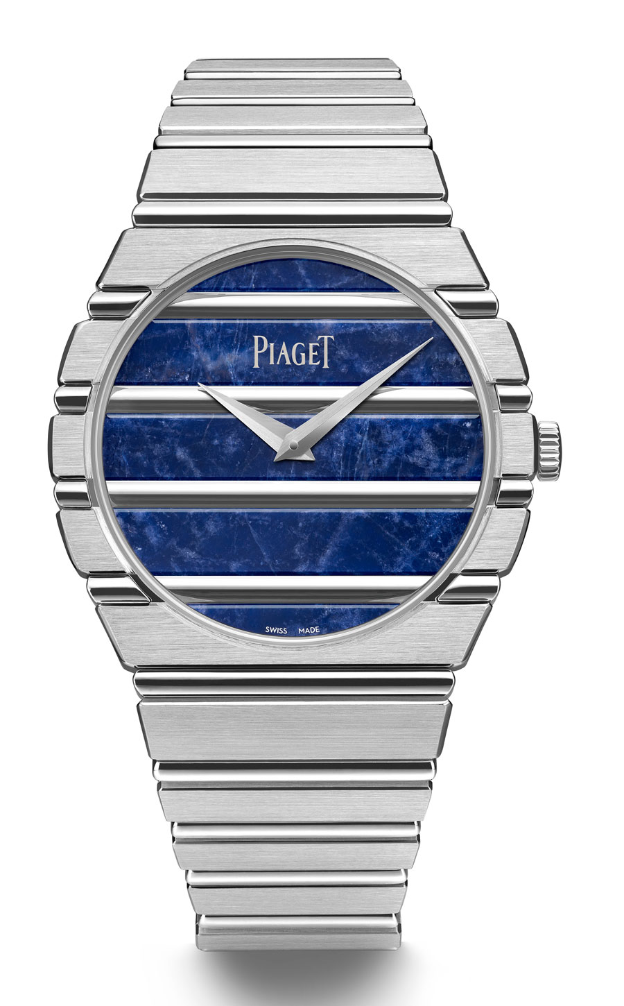Aujourd’hui, cette nouvelle Polo 79 conserve un format de 38 mm de diamètre pour 7,45 mm d’épaisseur. Le boîtier en or blanc 18 carats associe une finition satinée à des godrons polis, repris sur le bracelet intégré dans le même matériau. Ce qui la distingue surtout est son cadran en sodalite. Cette pierre ornementale apporte un contraste visuel marqué avec l’or blanc et souligne la structure du cadran, lui aussi travaillé avec des godrons polis. Ce choix s’inscrit dans une continuité historique, la maison ayant déjà exploré l’onyx ou le lapis-lazuli sur des versions antérieures.