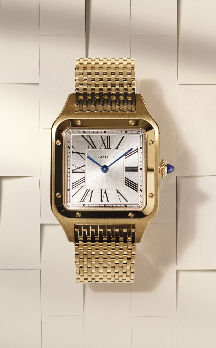 La Santos-Dumont est proposée ici dans une version en or jaune dotée d’un bracelet métallique intégré, conçu dans la continuité des premiers bracelets développés par la Maison dans les années 1920.