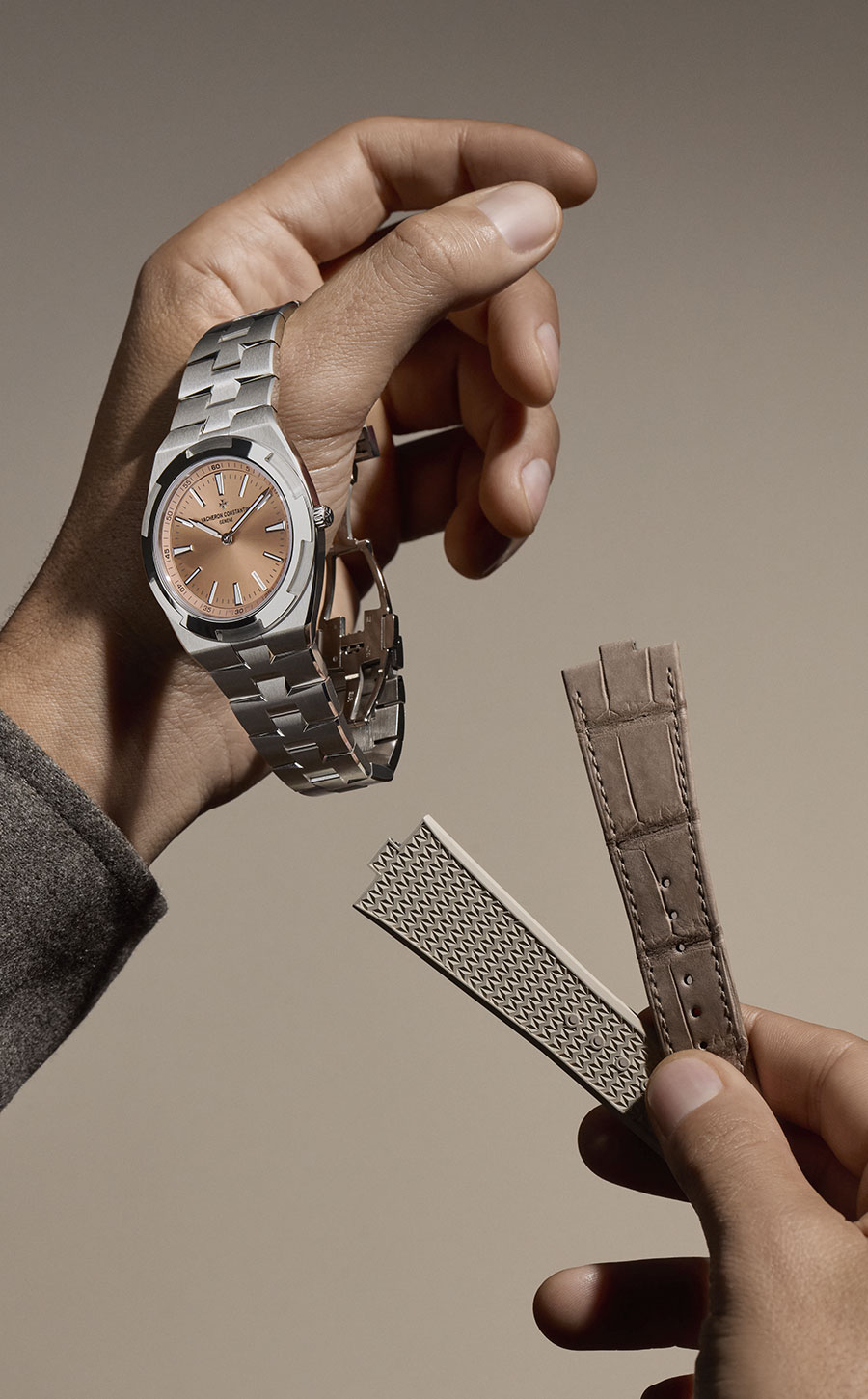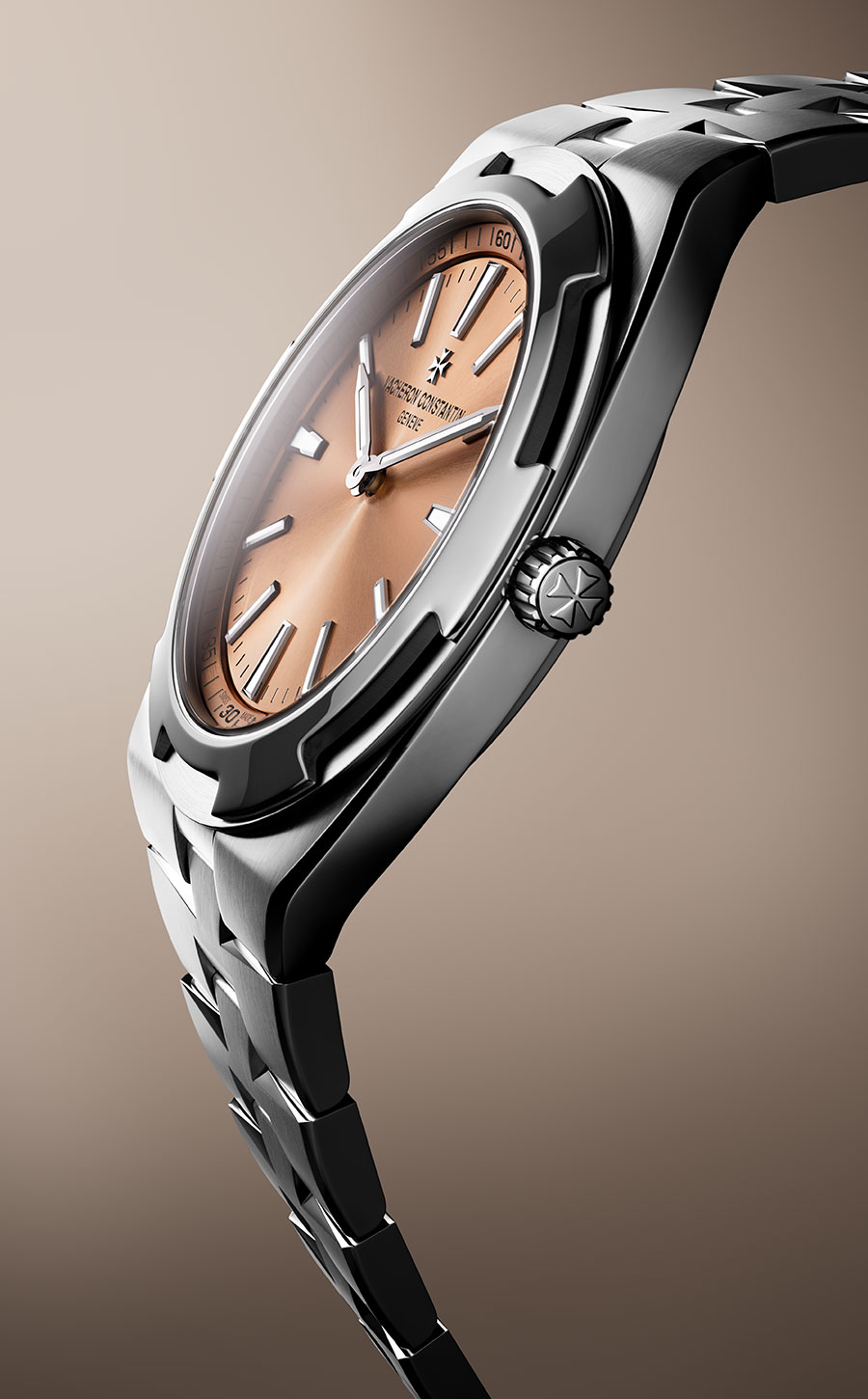 Visible à travers un fond en saphir, ce mouvement remarquable fait battre le cœur de la nouvelle Overseas automatique ultra-plate proposée dans un boîtier en platine 950 de 39,5 mm de diamètre pour 7,35 mm d’épaisseur. L’alliage utilisé, enrichi de cuivre et de gallium, bénéficie d’un traitement thermique augmentant sa résistance mécanique, annoncée comme 2,7 fois supérieure à celle d’un platine 950 standard. Offrant une étanchéité allant jusqu’à 50 mètres, la montre abrite un cadran laqué saumon à la finition satinée soleil, ponctué d’une minuterie périphérique. Les aiguilles et les index sont traités au Super-LumiNova® bleu.