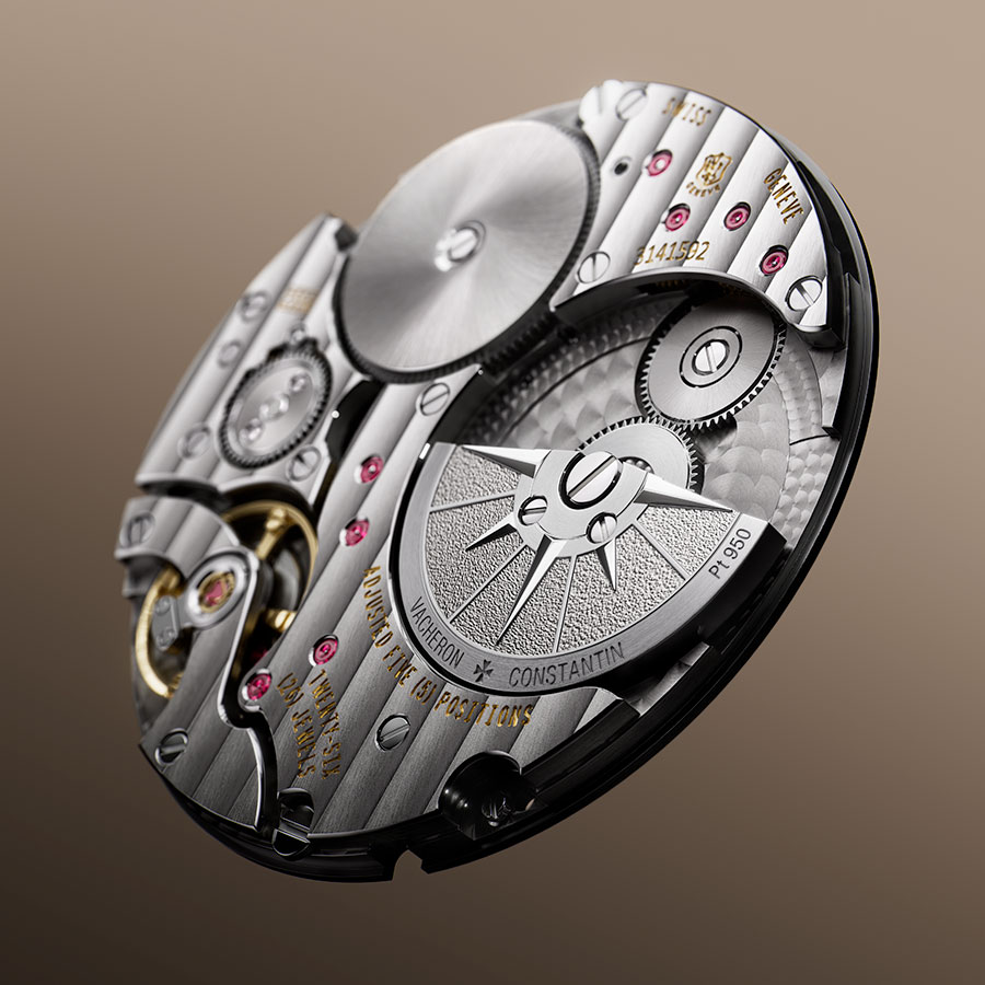 L’énergie est transmise du barillet supérieur vers l’inférieur, assurant une régularité de marche sur l’ensemble des 80 heures d’autonomie. Le train de rouage, repensé pour s’intégrer dans cet espace contraint, se compose de cinq roues organisées sur un seul plan, dont deux montées sur roulements à billes. Cette construction vise à améliorer le rendement énergétique tout en renforçant la robustesse de l’ensemble. Le balancier oscille à 3 Hz, soit 21 600 alternances par heure.