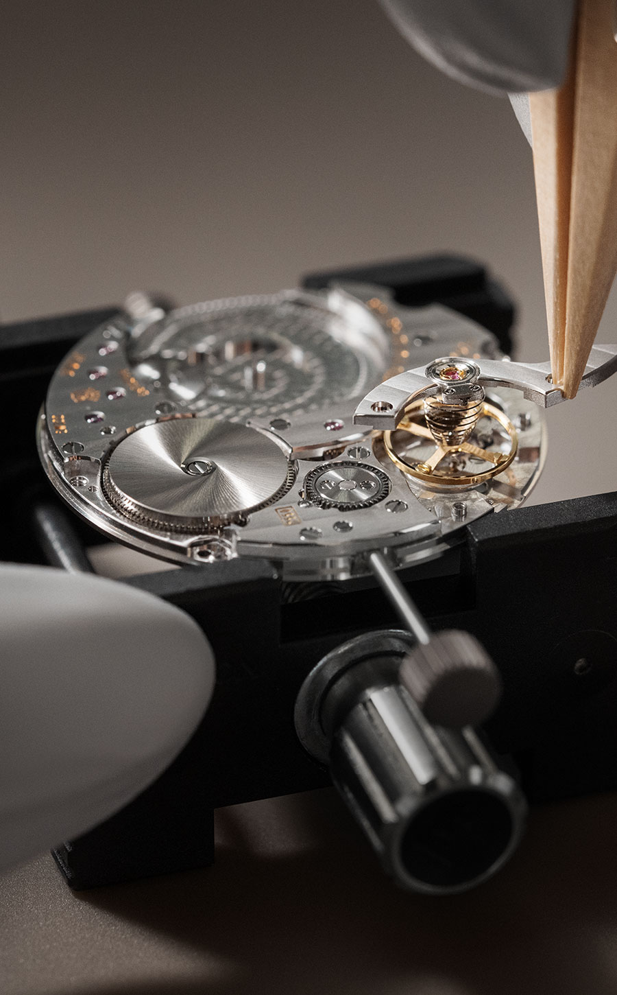 Le micro-rotor, intégré à la platine afin de limiter l’épaisseur, est réalisé en platine 950. Avec un diamètre de 15,5 mm, sa densité permet d’optimiser l’efficacité du remontage automatique sans recourir à une masse oscillante centrale plus volumineuse. Le système de double barillet suspendu adopte une configuration superposée inédite. Les deux barillets, montés en série et en position inversée, pivotent sur un axe unique fixé au pont. Cette disposition permet de supprimer un couvercle ainsi que le rochet, tout en maintenant un couple stable.