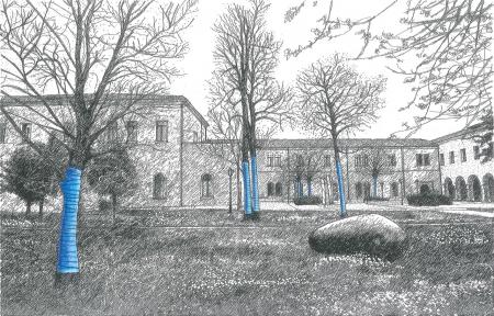 Présentée en collaboration avec la Galleria Ca’ D’oro, cette installation de Land Art veut sensibiliser les visiteurs sur les questions environnementales au travers de l’art. Les troncs des arbres sont enrubannés d’un tissu bleu, créant ainsi un paysage éphémère et insolite. Cette couleur bleue, présente dans la nature mais mise en lumière dans un contexte précis, incite le visiteur à se poser la question du message qu’a voulu donner l’artiste. L’apparence des arbres n’ont plus tout à fait la même apparence, mais ne sont pas non plus radicalement transformés. Ainsi, l’artiste espère faire comprendre aux visiteurs que peu de choses suffisent à changer l’environnement et que des gestes simples permettent de le sauvegarder.