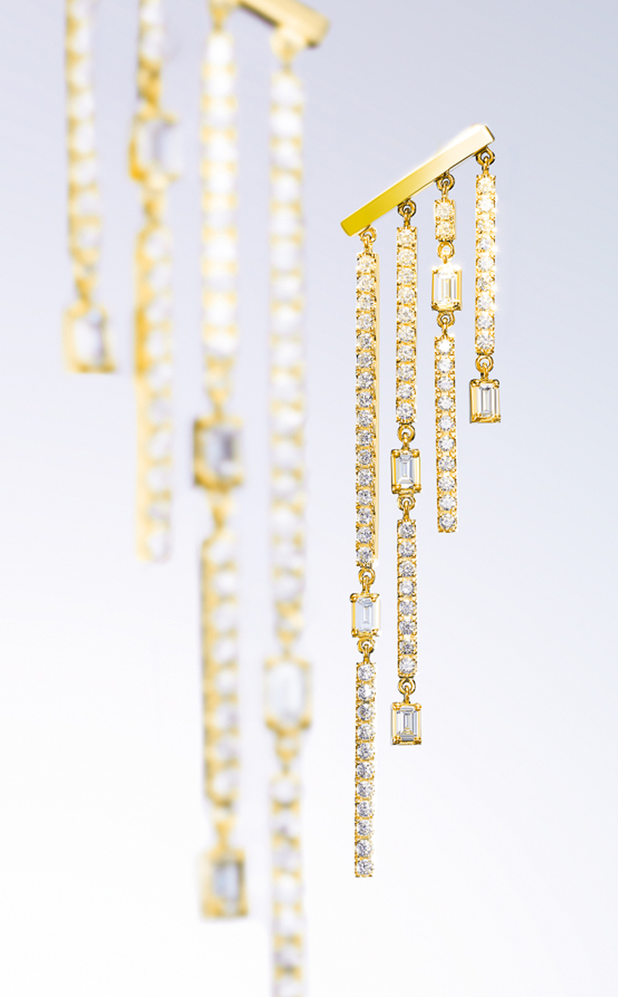 Telles des pampilles étincelantes, les créations « chandelier baguette » affichent la différence par leur cascade précieuse. La finesse des chaînes et des maillons facilitent cette danse joaillière délicate et sensuelle où vacillent et oscillent les pierres précieuses sublimant ainsi les modèles de leur flamme.