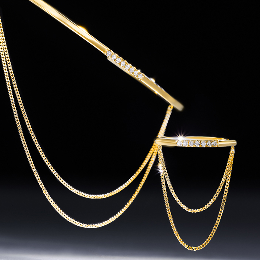 Magnifiés par des diamants taille baguette et des barrettes d’or jaune, les bijoux forment une architecture dynamique et minimaliste, à l’instar du choker. Pièce phare, il épouse asymétriquement le cou avec son fil en or rigide pour un « déséquilibre équilibré » sur la peau. Quant aux boucles d’oreilles, elles s’illustrent par leur descente interminable ornée de dix diamants taille baguette.