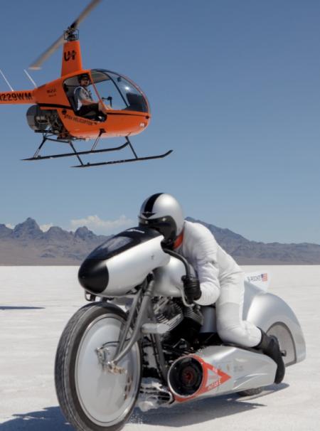 L’aboutissement d’un rêve. Rouler à Bonneville pour y tourner un film n’est pas seulement une affaire de voyage et de logistique, même si cette partie est assez complexe à mettre en place. Il faut aussi un bon pilote pour emmener la machine. Ce sont donc les artistes de chez Shaw qui ont « mouillé la chemise ». Et encore une fois quelques événements non prévus sont venus corser l’histoire. Niels Sefton, un des membres de la concession et fin pilote réputé, devait conduire la machine sur la piste. A quelques jours du départ, il se blesse et doit donc renoncer. Un remplaçant est trouvé au pied levé. C’est aussi un collaborateur de la concession Shaw, motard depuis toujours mais pas vraiment aguerri à ce genre de pratique sur le lac salé. Simon Pocock explique : « J’ai beaucoup pratiqué le moto cross et je roule à moto depuis toujours mais je ne suis pas ce qu’on appelle un pilote de vitesse pure. J’étais là au bon moment, il fallait remplacer Niels. J’y suis allé. En dépit du fait que mon collègue était blessé et devait renoncer, j’étais aux anges. J’allais enfin réaliser mon rêve de rouler sur le lac salé ».