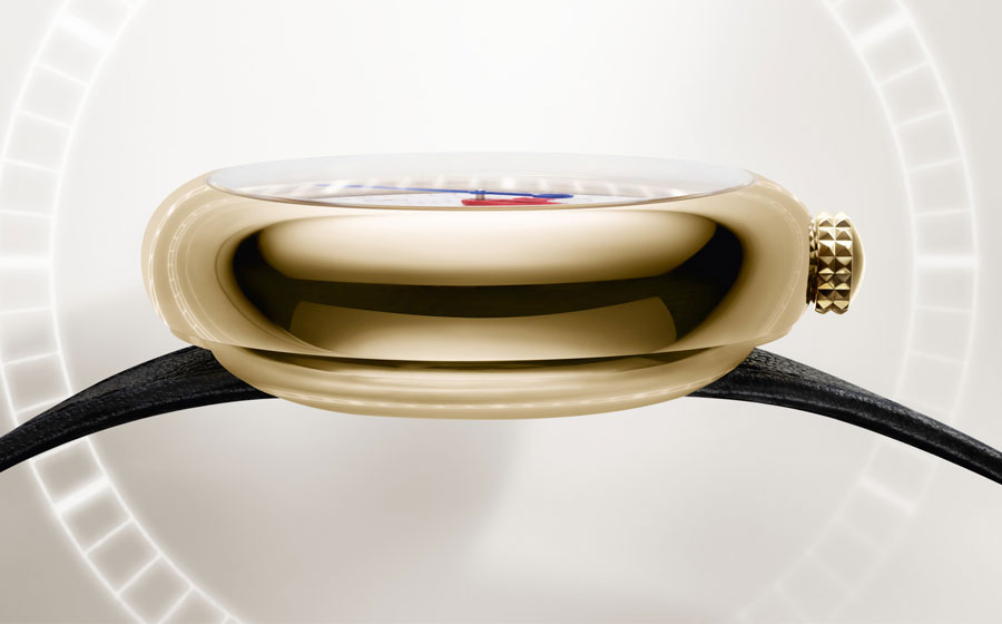 La nouvelle Monterey conserve les fondamentaux : un boîtier de 39 mm en or jaune, totalement poli miroir, aux contours organiques. La suppression des cornes accentue l’effet galet, comme une pierre adoucie par le temps. La couronne, repositionnée à midi, adopte une texture « Clous de Paris », usinée puis polie à la main, rappelant le patrimoine maroquinier de la Maison.