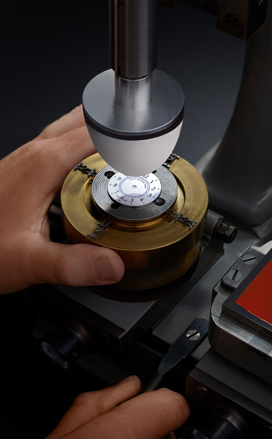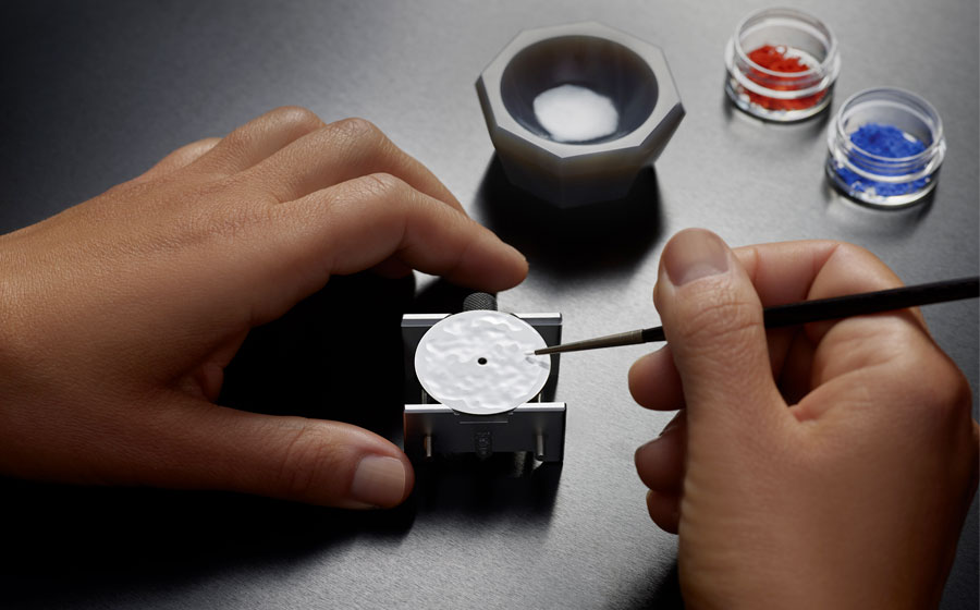 Chaque étape peut anéantir le travail précédent : une bulle, une fissure, et il faut tout recommencer. Le choix du blanc pur est encore plus ambitieux : il s’agit d’une teinte extrêmement délicate à obtenir. Les poudres d’émail sont inspectées au microscope avant application au pinceau sur un disque d’or blanc traité. Quatre couches principales, polissages et cuissons successives aboutissent à une surface d’une brillance quasi-opaline, inaltérable au temps et aux UV.
